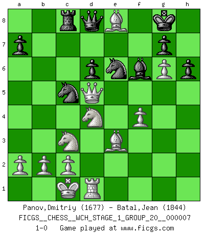 Last move : 1-0 2009 November 8 23:41:18 [Event "FICGS__CHESS__WCH_STAGE_1_GROUP_20__000007"] [Site "FICGS"] [Date "2009.11.02"] [Round "1"] [White "Panov,Dmitriy"] [Black "Batal,Jean"] [Result "1-0"] [WhiteElo "1677"] [BlackElo "1844"] 1.e4 d6 2.d4 Nf6 3.Nc3 Nbd7 4.f4 c5 5.e5 cxd4 6.Qxd4 Ng4 7.exd6 exd6 8.Nf3 Ngf6 9.Be3 Be7 10.g4 O-O 11.g5 Ne8 12.O-O-O Nc5 13.h4 Nc7 14.h5 Bg4 15.Be2 Re8 16.g6 fxg6 17.hxg6 h6 18.Bc4+ N7e6 19.Qd5 Rc8 20.Nd4 b5 21.Bxb5 Bxd1 22.Rxd1 Bf6 23.Bxe8 1-0 Comment by player 2 : Jean Batal : Well played. Congrats. Pirc defense Kingside Castling by player Black (move 10) Queenside Castling by player White (move 12) Player White won this chess game. Follow this game move after move (download)Bobby is the most misunderstood, misquoted celebrity walking the face of this earth. (Yasser Seirawan) Ohne Fehler kann es keine Brillanz geben. (Emanuel Lasker) Jugadores de primera clase pierden en contra de jugadores de segunda clase porque los jugadores de segunda clase a veces juegan una partida de primer clase. (Siegbert Tarrasch) Les réformistes prétendent que les progrès de la théorie conduiront à la disparition des échecs, et qu'il faut, pour leur rendre vie, en remanier les règles. En réalité, qu'exprime cette affirmation? Le mépris de l'intuition, de l'imagination et de tous les autres éléments qui font des échecs un art. (Alexander Alekhine) The only thing that overcomes hard luck is hard work. (Harry Golden)