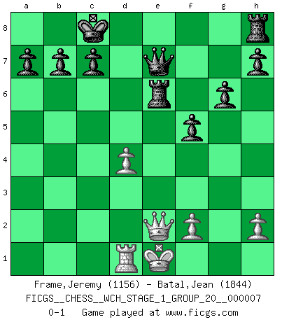 Last move : 0-1 2009 November 14 22:54:37 [Event "FICGS__CHESS__WCH_STAGE_1_GROUP_20__000007"] [Site "FICGS"] [Date "2009.11.02"] [Round "1"] [White "Frame,Jeremy"] [Black "Batal,Jean"] [Result "0-1"] [WhiteElo "1156"] [BlackElo "1844"] 1.e4 d5 2.exd5 Nf6 3.Nc3 Nxd5 4.Nxd5 Qxd5 5.Nf3 Nc6 6.d4 Bg4 7.Be2 O-O-O 8.c3 e5 9.Be3 exd4 10.Nxd4 Bxe2 11.Qxe2 Nxd4 12.cxd4 Qxg2 13.O-O-O Qd5 14.Qg4+ f5 15.Qf4 Bd6 16.Qg5 g6 17.Rhe1 Qxa2 18.Bf4 Bxf4+ 19.Qxf4 Rd6 20.Re7 Rc6+ 21.Kd2 Qxb2+ 22.Ke1 Qb4+ 23.Qd2 Qxe7+ 24.Qe2 Re6 0-1 Scandinavian defense Queenside Castling by player Black (move 7) Queenside Castling by player White (move 13) Player Black won this chess game. Follow this game move after move (download)I played Chess with him and would have beaten him sometimes only he always took back his last move, and ran the game out differently. (Mark Twain) Gewöhnliche Menschen denken nur daran, wie sie ihre Zeit verbringen. Ein intelligenter Mensch versucht, sie auszunutzen. (Arthur Schopenhauer) En un gambito tu regalas un Peón por el bién de tomar un juego perdido. (Samuel Standige Boden) Ne tendez aucun piège pour le plaisir ! Ne jouez rien dans l'espoir que l'adversaire réagisse de façon stupide ! Prenez toujours pour acquis que l'adversaire va trouver le meilleur coup ! Ne jouez jamais de coup dans l'espoir que l'adversaire ne voie pas la menace ! Chacun de vos coups doit améliorer la position d'une façon ou d'une autre. The beginning of wisdom is silence. The second step is listening. (Unknown)