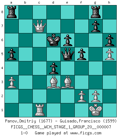 Last move : 1-0 2009 November 16 19:38:59 [Event "FICGS__CHESS__WCH_STAGE_1_GROUP_20__000007"] [Site "FICGS"] [Date "2009.11.02"] [Round "1"] [White "Panov,Dmitriy"] [Black "Guisado,Francisco"] [Result "1-0"] [WhiteElo "1677"] [BlackElo "1599"] 1.e4 c5 2.c3 e6 3.d4 d5 4.e5 Nc6 5.Nf3 Nge7 6.Bd3 cxd4 7.cxd4 Bd7 8.Nc3 Ng6 9.a3 Be7 10.h4 Qb6 11.h5 Nf8 12.Na4 Qd8 13.Be3 h6 14.Nd2 a6 15.O-O Qa5 16.b4 Qd8 17.Nc5 Bxc5 18.bxc5 b6 19.cxb6 Qxb6 20.Rb1 Qc7 21.Qg4 Rg8 22.Nb3 a5 23.Nc5 Nxe5 24.dxe5 Qxe5 25.Rfc1 f5 26.Nxd7 Nxd7 27.Qg6+ Ke7 28.Rb7 d4 29.Rxd7+ Kxd7 30.Qf7+ Kd6 31.Qc7+ 1-0 Sicilian : Alapin's variation (2.c3) Kingside Castling by player White (move 15) Player White won this chess game. Follow this game move after move (download)A man without frontiers. He didn't divide the East and the West, he brought them together in their admiration for him. (Ljubomir Ljubojevic, about Bobby Fischer's death) Karpov ist ein Museumsstück. (Garry Kasparov) La estratégia requiere pensar, la táctica requiere observación. (Max Euwe) J'ai toujours senti une vague pitié pour l'homme qui ne connaît rien aux échecs, tout comme j'en aurais pour un homme ignorant de l'amour. Les Echecs, comme la musique ou comme l'amour, ont le pouvoir de rendre heureux. (Siegbert Tarrasch) As a goal marker shodan is important. As a destination it is a poor place to stop. (Thomas Tamayo)