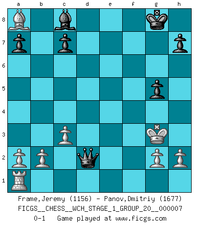 Last move : 0-1 2009 November 11 4:28:30 [Event "FICGS__CHESS__WCH_STAGE_1_GROUP_20__000007"] [Site "FICGS"] [Date "2009.11.02"] [Round "1"] [White "Frame,Jeremy"] [Black "Panov,Dmitriy"] [Result "0-1"] [WhiteElo "1156"] [BlackElo "1677"] 1.e4 e5 2.Nf3 Nf6 3.Nxe5 d6 4.Nf3 Nxe4 5.d4 d5 6.c3 Bd6 7.Be2 O-O 8.Be3 Nc6 9.Nbd2 f5 10.O-O f4 11.Nxe4 dxe4 12.d5 fxe3 13.dxc6 exf3 14.Bxf3 exf2+ 15.Rxf2 bxc6 16.Qf1 Qg5 17.Bxc6 Rxf2 18.Qxf2 Bc5 19.Bxa8 Bxf2+ 20.Kxf2 Qd2+ 21.Kg3 g5 0-1 Petrov : Classical attack Kingside Castling by player Black (move 7) Kingside Castling by player White (move 10) Player Black won this chess game. Follow this game move after move (download)Chess is thirty to forty percent psychology. You don't have this when you play a computer. I can't confuse it. (Judith Polgar) Du kannst im Schach nur gut werden, wenn du das Spiel liebst. (Robert James Fischer) El jugador blanco perdió porque fallo en recordar la coreccta continuación y tuvo que pensar por sí mismo las movidas. (Siegbert Tarrasch) Toute estimation doit être constamment réévaluée. (Jacob Estrin) You think that education is too expensive ? Try ignorance. (Derek Bok)