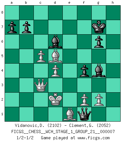 Last move : 1/2-1/2 2009 December 7 18:43:18 [Event "FICGS__CHESS__WCH_STAGE_1_GROUP_21__000007"] [Site "FICGS"] [Date "2009.11.02"] [Round "1"] [White "Vidanovic,Djordje"] [Black "Clement,George"] [Result "1/2-1/2"] [WhiteElo "2102"] [BlackElo "2052"] 1.e4 e5 2.Nf3 Nf6 3.d4 Nxe4 4.Bd3 d5 5.Nxe5 Nd7 6.Nxd7 Bxd7 7.O-O Bd6 8.c4 c6 9.Nc3 O-O 10.cxd5 Nxc3 11.bxc3 cxd5 12.Qh5 f5 13.Qf3 Kh8 14.Bd2 Qa5 15.Rfe1 Rae8 16.a4 g6 17.h4 Rxe1+ 18.Rxe1 Re8 19.Rxe8+ Bxe8 20.h5 Qd8 21.Bc2 Qh4 22.Bb3 Bc6 23.Bxd5 Qh2+ 24.Kf1 Qh1+ 25.Ke2 Bxa4 26.Be1 Kg7 27.hxg6 hxg6 28.Qe3 Bd7 29.c4 f4 30.Qc3 Bg4+ 31.Kd2 Qf1 32.c5 1/2-1/2 Petrov : Modern attack, Symmetrical variation Kingside Castling by player White (move 7) Kingside Castling by player Black (move 9) This chess game ended in a draw. Follow this game move after move (download)In Chess, just as in life, today's bliss may be tomorrow's poison. (Assaic) Ich las kürzlich ein Buch von Nietzsche. Er sagte Religion verdumme nur die Menschen. Ich stimme zu. (Robert James Fischer) Un mal plan es mejor que no tener ningún plan. (Frank Marshall) Toutes choses étant égales, c'est la conviction qui gagne. Alliée à une volonté de vaincre, elle sert de détonateur, suscite des idées, disperse les doutes et aide à penser clairement. (Robert Fischer) Good luck. You're gonna need it. (Han Solo in Star Wars ep.6)