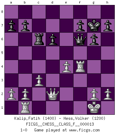 Last move : 1-0 2006 November 29 17:59:50 [Event "FICGS__CHESS__CLASS_F__000013"] [Site "FICGS"] [Date "2006.10.02"] [Round "1"] [White "Kalip,Fatih"] [Black "Hess,Volker"] [Result "1-0"] [WhiteElo "1400"] [BlackElo "1200"] 1.e4 c5 2.Nf3 d6 3.d4 cxd4 4.Nxd4 e5 5.Nf3 Bg4 6.Nc3 Nf6 7.Bg5 Be7 8.Rb1 O-O 9.Bc4 Nc6 10.Be2 Nd4 11.Nxd4 Bxe2 12.Ndxe2 Nd7 13.Bxe7 Qxe7 14.Ng3 Rac8 15.Nf5 Qe6 16.Nd5 Nf6 17.Nfe7+ Kh8 18.Nxc8 Rxc8 19.Nxf6 Qxf6 20.O-O Rc6 21.c3 g6 22.Qd2 Kg7 23.f4 exf4 24.Rxf4 1-0 Sicilian Kingside Castling by player Black (move 8) Kingside Castling by player White (move 20) Player White won this chess game. Follow this game move after move (download)All I want to do, ever, is just play Chess. (Bobby Fischer) Sehr viele beherrschen heutzutage das große Einmalseins des Schachspiels und kennen sogar dessen Logarithmentafeln auswendig - deshalb sollte man hin und wieder zu beweisen trachten, dass zwei mal zwei auch fünf sein kann. (Mikhail Nekhemyevich Tal) El Ajedrez es tan inspirador que yo no creo que un buen jugador sea capaz de tener un pensamiento malo durante una partida. (Wilhelm Steinitz) A ce moment-là, je menaçais de comprendre la position ! (Clément L'Heureux) A government big enough to give you everything you want is strong enough to take everything you have. (Thomas Jefferson)