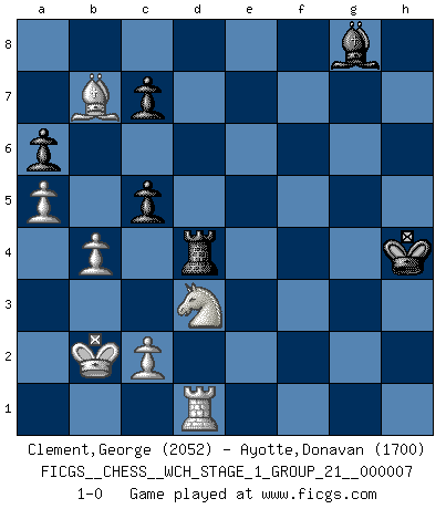 Last move : 1-0 2010 February 5 20:19:16 [Event "FICGS__CHESS__WCH_STAGE_1_GROUP_21__000007"] [Site "FICGS"] [Date "2009.11.17"] [Round "1"] [White "Clement,George"] [Black "Ayotte,Donavan"] [Result "1-0"] [WhiteElo "2052"] [BlackElo "1700"] 1.e4 e5 2.Nf3 Nc6 3.d4 exd4 4.Nxd4 Nf6 5.Nxc6 dxc6 6.Qxd8+ Kxd8 7.f3 Be6 8.Nc3 Bc5 9.Ne2 Ke8 10.Bf4 Rc8 11.a4 Rg8 12.a5 a6 13.Bd2 Rd8 14.O-O-O g5 15.h4 h6 16.hxg5 hxg5 17.Rh2 Ke7 18.g4 Nd7 19.Rh5 Ne5 20.Rxg5 f6 21.Rxg8 Bxg8 22.g5 Rc8 23.b4 Bf2 24.gxf6+ Kxf6 25.Bc3 Be3+ 26.Kb2 Re8 27.f4 Bxf4 28.Nxf4 Kg5 29.Nh3+ Kh4 30.Nf2 c5 31.Bxe5 Rxe5 32.Nd3 Rxe4 33.Bg2 Rd4 34.Bxb7 1-0 This chess game has been lost on time (started : 2009.11.17 22:56:6) Scotch : Schmidt variation Queenside Castling by player White (move 14) Player White won this chess game. Follow this game move after move (download)Look at Garry Kasparov. After he loses, invariably he wins the next game. He just kills the next guy. That's something that we have to learn to be able to do. (Maurice Ashley) Drei Punkte vor allen anderen ist wie einer, der im weißen Anzug posiert, während der Rest in Müllsäcke gekleidet dasteht. (Viktor Kortschnoi) En un gambito tu regalas un Peón por el bién de tomar un juego perdido. (Samuel Standige Boden) Il n'y a pas eu de défaite parce que je ne crois pas que cet ordinateur ait jamais existé. IBM a triché en refusant d'imprimer les modes de recherche de la machine. C'est évident, pendant le match, des coups décisifs ont été joués par des êtres humains. Aujourd'hui, les meilleurs spécialistes en informatique ne peuvent toujours pas expliquer comment Deep-Blue a pu jouer contre la logique des ordinateurs. IBM a gagné une guerre de communication, mais ils sont incapables de prouver que l'ordinateur a gagné tout seul. (Garry Kasparov) Shallow men believe in luck. Strong men belive in cause and effect. (Ralph Waldo Emerson)