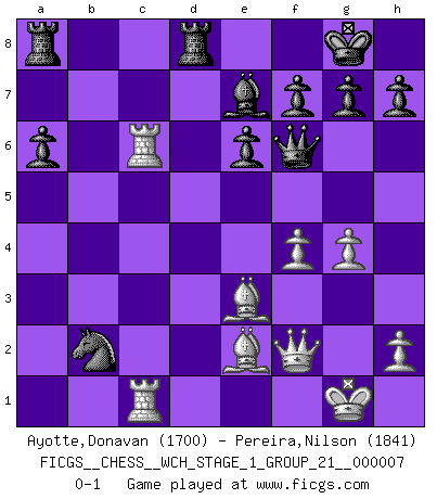 Last move : 0-1 2010 February 11 20:32:38 [Event "FICGS__CHESS__WCH_STAGE_1_GROUP_21__000007"] [Site "FICGS"] [Date "2009.11.17"] [Round "1"] [White "Ayotte,Donavan"] [Black "Pereira,Nilson"] [Result "0-1"] [WhiteElo "1700"] [BlackElo "1841"] 1.e4 c5 2.Nf3 d6 3.Bc4 Nf6 4.Nc3 e6 5.O-O a6 6.d4 cxd4 7.Nxd4 b5 8.Be2 Bb7 9.Be3 Nbd7 10.a3 Be7 11.Qd2 O-O 12.f3 Qc7 13.Qe1 d5 14.exd5 Nxd5 15.Nxd5 Bxd5 16.a4 b4 17.Rc1 Nc5 18.c3 Qe5 19.Qf2 bxc3 20.Rxc3 Nxa4 21.Nc6 Bxc6 22.Rxc6 Rfd8 23.Rfc1 Nxb2 24.f4 Qf5 25.g4 Qf6 0-1 This chess game has been lost on time (started : 2009.11.17 22:56:6) Sicilian Kingside Castling by player White (move 5) Kingside Castling by player Black (move 11) Player Black won this chess game. Follow this game move after move (download)The blunders are all there on the board, waiting to be made. (Savielly Tartakover) Schach ist die gewalttätigste aller Sportarten. (Garry Kasparov) La estratégia requiere pensar, la táctica requiere observación. (Max Euwe) La tactique est l'élément le plus important du milieu de jeu. (Siegbert Tarrasch) First of all, we have to go back to the classical time control. (Anatoly Karpov)