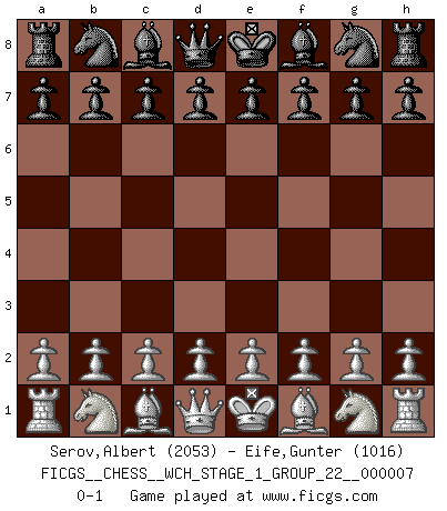 Last move : 0-1 2010 January 2 8:20:39 [Event "FICGS__CHESS__WCH_STAGE_1_GROUP_22__000007"] [Site "FICGS"] [Date "2009.11.02"] [Round "1"] [White "Serov,Albert"] [Black "Eife,Gunter"] [Result "0-1"] [WhiteElo "2053"] [BlackElo "1016"] 0-1 Player Black won this chess game. Follow this game move after move (download)Those who say they understand Chess, understand nothing. (Robert Hubner) Schach ist ein Kampf gegen den Fehler. (Johannes Herrman Zukertort) Bobby solo arroja las piezas y solas caen en las casillas correctas. (Miguel Najdorf ) Les réformistes prétendent que les progrès de la théorie conduiront à la disparition des échecs, et qu'il faut, pour leur rendre vie, en remanier les règles. En réalité, qu'exprime cette affirmation? Le mépris de l'intuition, de l'imagination et de tous les autres éléments qui font des échecs un art. (Alexander Alekhine) Real knowledge is to know the extent of one's ignorance. (Confucius)