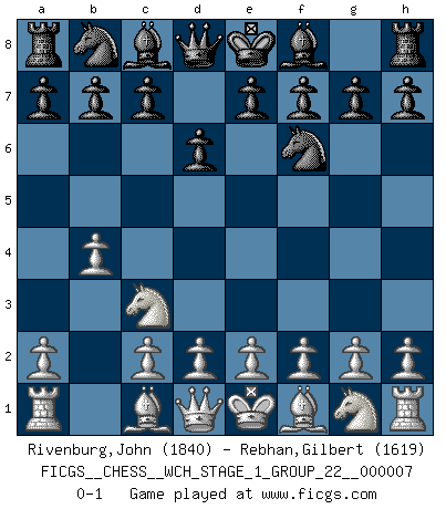 Last move : 0-1 2009 December 6 21:19:3 [Event "FICGS__CHESS__WCH_STAGE_1_GROUP_22__000007"] [Site "FICGS"] [Date "2009.11.02"] [Round "1"] [White "Rivenburg,John"] [Black "Rebhan,Gilbert"] [Result "0-1"] [WhiteElo "1840"] [BlackElo "1619"] 1.b4 d6 2.Nc3 Nf6 0-1 This chess game has been lost on time (started : 2009.11.02 22:47:9) Polish (Sokolsky) opening Player Black won this chess game. Follow this game move after move (download)When you play Bobby, it is not a question if you win or lose. It is a question if you survive. (Boris Spassky) Ohne ihre Erfolge schmälern zu wollen würde ich sagen Petrosian, Spassky und Karpov verdanken ihre Siege ihren Trainern - Boleslavsky, Bondarevsky und Furman. (Mikhail Moiseyevich Botvinik) Tu cuerpo tiene que estar en óptima condición. Tu Ajedrez se deteriora como lo hace tu cuerpo. No puedes separar la mente y el cuerpo. (Bobby Fischer) Le système Elo représente seulement une moyenne. Il est simplement un indicateur de votre stabilité. (Anatoli Karpov) The weakness of an artist is dogma. (Josh Waitzkin)