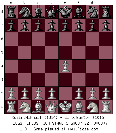 Last move : 1-0 2009 November 29 8:52:43 [Event "FICGS__CHESS__WCH_STAGE_1_GROUP_22__000007"] [Site "FICGS"] [Date "2009.11.02"] [Round "1"] [White "Ruzin,Mikhail"] [Black "Eife,Gunter"] [Result "1-0"] [WhiteElo "1814"] [BlackElo "1016"] 1.e4 1-0 King's pawn Opening Player White won this chess game. Follow this game move after move (download)Live, lose, and learn, by observing your opponent how to win. (Amber Steenbock) Ein guter Spieler hat immer Glück. (José Raúl Capablanca) La táctica fluye a partir de una posición superior. (Bobby Fischer) Toute estimation doit être constamment réévaluée. (Jacob Estrin) All the troubles of the world come from being unable to sit alone in a quiet room. (Blaise Pascal)