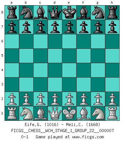 Last move : 0-1 2009 November 29 8:52:55 [Event "FICGS__CHESS__WCH_STAGE_1_GROUP_22__000007"] [Site "FICGS"] [Date "2009.11.02"] [Round "1"] [White "Eife,Gunter"] [Black "Meli,Cosimo Leonardo"] [Result "0-1"] [WhiteElo "1016"] [BlackElo "1668"] 0-1 Player Black won this chess game. Follow this game move after move (download)As one by one I mowed them down, my superiority soon became apparent. (Jose Capablanca) Wenn ein Kopf und ein Buch zusammenstoßen und es klingt hohl, ist es denn allemal im Buche? (Georg Christoph Lichtenberg) Los errores estan ahí, esperando a que se cometan. (Savielly Tartakower) Votre prénom est 'Tactique', votre deuxième prénom est 'Tactique' et votre nom est 'Tactique'. (Ken Smith) I find your interest interesting. (Gregory House, House M.D.)