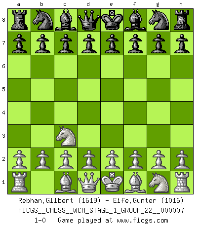 Last move : 1-0 2009 November 29 8:53:14 [Event "FICGS__CHESS__WCH_STAGE_1_GROUP_22__000007"] [Site "FICGS"] [Date "2009.11.02"] [Round "1"] [White "Rebhan,Gilbert"] [Black "Eife,Gunter"] [Result "1-0"] [WhiteElo "1619"] [BlackElo "1016"] 1.Nc3 1-0 Dunst (Sleipner, Heinrichsen) Opening Player White won this chess game. Follow this game move after move (download)When you absolutely don't know what to do anymore, it is time to panic. (John van der Wiel) Du musst Deinen Gegner in einen tiefen dunklen Wald führen wo 2+2=5 ist und wo der Weg, der wieder hinausführt, nur breit genug für einen ist. (Mikhail Nekhemyevich Tal) En el Ajedrez, tal como en la vida, las bendiciones de hoy pueden ser el veneno del mañana. (Assaic) Des combinaisons [dans le jeu d'échecs] pareilles à des mélodies. Je crois entendre pour ainsi dire la musique des coups... (Vladimir Nabokov) Always be a first-rate version of yourself, instead of a second-rate version of somebody else. (Judy Garland)