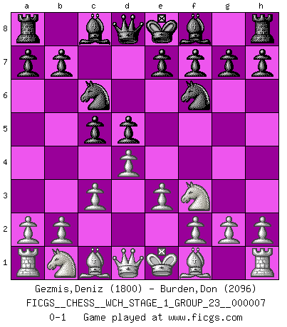 Last move : 0-1 2010 January 2 8:20:39 [Event "FICGS__CHESS__WCH_STAGE_1_GROUP_23__000007"] [Site "FICGS"] [Date "2009.11.17"] [Round "1"] [White "Gezmis,Deniz"] [Black "Burden,Don"] [Result "0-1"] [WhiteElo "1800"] [BlackElo "2096"] 1.d4 Nf6 2.Nf3 d5 3.e3 c5 4.c3 Nc6 0-1 This chess game has been lost on time (started : 2009.11.17 22:53:37) Queen's pawn game Player Black won this chess game. Follow this game move after move (download)Chess is 99 percent tactics. (Teichmann) Nie in meinem Leben habe ich die französische Verteidigung gespielt, welche die Stumpfsinnigste von allen ist. (Wilhelm Steinitz) Yo considero que Fischer es uno de los expertos mas grandes de aperturas de siempre. (Keith Hayward) Avec des compensations pour le matériel en plus... (Anonyme) A person who never made a mistake never tried anything new. (Albert Einstein)