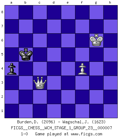 Last move : 1-0 2010 April 1 6:32:12 [Event "FICGS__CHESS__WCH_STAGE_1_GROUP_23__000007"] [Site "FICGS"] [Date "2009.11.02"] [Round "1"] [White "Burden,Don"] [Black "Wagschal,Jean-Philippe"] [Result "1-0"] [WhiteElo "2096"] [BlackElo "1623"] 1.e4 e5 2.Nf3 Nc6 3.Bc4 Nf6 4.Ng5 d5 5.exd5 Na5 6.Bb5+ c6 7.dxc6 bxc6 8.Qf3 Be7 9.Bxc6+ Nxc6 10.Qxc6+ Bd7 11.Qf3 O-O 12.d3 Ng4 13.Nh3 Rc8 14.Nc3 Rc6 15.Qe2 Nh6 16.O-O Bxh3 17.gxh3 Qd7 18.Kh1 Qxh3 19.Rg1 Nf5 20.Qe4 Nd4 21.Bf4 Qf3+ 22.Qxf3 Nxf3 23.Rg3 exf4 24.Rxf3 Rb8 25.Nd5 Bd6 26.c4 Rxb2 27.Nxf4 Bxf4 28.Rxf4 Rd6 29.d4 Kf8 30.d5 a5 31.Kg1 g5 32.Rd4 Rf6 33.d6 Ke8 34.Rf1 Rf4 35.Rxf4 gxf4 36.Rc1 Kd7 37.c5 Kc6 38.Kg2 Rd2 39.Kf3 h6 40.a4 Rd4 41.Rc2 h5 42.h4 f6 43.Rc3 f5 44.Rc2 Rd3+ 45.Kxf4 Rd1 46.Kxf5 Rd5+ 47.Kg6 Rd4 48.Kxh5 Rd5+ 49.Kg6 Rd4 50.h5 Rxa4 51.Rd2 Rg4+ 52.Kh7 Re4 53.d7 Re7+ 54.Kg6 Rxd7 55.Rxd7 Kxd7 56.h6 Kc6 57.h7 Kxc5 58.h8Q a4 59.Qc3+ Kb5 60.f4 1-0 Two knights defense Kingside Castling by player Black (move 11) Kingside Castling by player White (move 16) 10 pieces endgame at move 48 : White KRPPPPP , Black KRP WHITE : King + 1 Rook 5 Pawns BLACK : King + 1 Rook 1 Pawn 9 pieces endgame at move 50 : White KRPPPP , Black KRP WHITE : King + 1 Rook 4 Pawns BLACK : King + 1 Rook 1 Pawn 8 pieces endgame at move 54 : White KRPPP , Black KRP WHITE : King + 1 Rook 3 Pawns BLACK : King + 1 Rook 1 Pawn 7 pieces endgame at move 55 : White KRPPP , Black KP WHITE : King + 1 Rook 3 Pawns BLACK : King + 1 Pawn 6 pieces endgame at move 55 : White KPPP , Black KP WHITE : King + 3 Pawns BLACK : King + 1 Pawn 5 pieces endgame at move 57 : White KPP , Black KP WHITE : King + 2 Pawns BLACK : King + 1 Pawn Promotion Queen by player White (move 58) Player White won this chess game. Follow this game move after move (download)All Chess players should have a hobby. (Savielly Tartakower) Gegen einen Schachcomputer zu verlieren ist wie Löcher in den Strümpfen zuhaben. Es ist nicht peinlich, solange man der einzige ist der es weiß. (Anonymous) Debemos de asegurarnos de que el Ajedrez no se convierta en un lenguaje muerto, muy interesante, pero tan solo para un grupo muy pequeño. (Sytze Faber) Mais n'est-ce pas déjà le limiter injurieusement que d'appeler les échecs un jeu? N'est-ce pas aussi une science, un art, ou quelque chose qui, comme le cercueil de Mahomet entre ciel et terre, est suspendu entre l'un et l'autre, et qui réunit un nombre incroyable de contraires ? (Stefan Zweig) But they are useless. They can only give you answers. (Pablo Picasso, about computers)