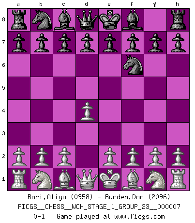 Last move : 0-1 2009 December 4 8:56:40 [Event "FICGS__CHESS__WCH_STAGE_1_GROUP_23__000007"] [Site "FICGS"] [Date "2009.11.02"] [Round "1"] [White "Bori,Aliyu"] [Black "Burden,Don"] [Result "0-1"] [WhiteElo "0958"] [BlackElo "2096"] 1.d4 Nf6 0-1 This chess game has been lost on time (started : 2009.11.02 22:48:37) Queen's pawn game Player Black won this chess game. Follow this game move after move (download)White lost because he failed to remember the right continuation and had to think up the moves himself. (Siegbert Tarrasch) Es genügt nicht ein guter Spieler zu sein, man muß auch gut spielen. (Siegbert Tarrasch) Si yo gano un torneo, yo lo gano por mí mismo. Yo hago las jugadas. Nadie me ayuda. (Bobby Fischer) Echiquier : carré parfait, comme la Jérusalem nouvelle décrite par l'auteur de l'Apocalypse, huit cases sur huit, exaltation du chiffre 4, symbole du cosmos aux quatre horizons... où le noir et le blanc, l'ombre et la lumière, le mal et le bien s'entremêlent et se conjuguent. (Robert Couffignal, Le Gambit du poète) A clear conscience is usually the sign of a bad memory. (Unknown)