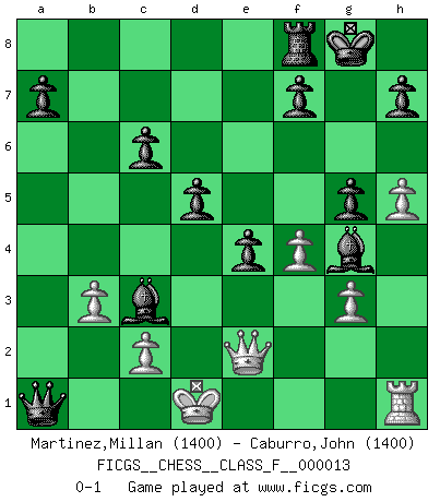 Last move : 0-1 2006 October 28 8:44:30 [Event "FICGS__CHESS__CLASS_F__000013"] [Site "FICGS"] [Date "2006.10.02"] [Round "1"] [White "Martinez,Millan"] [Black "Caburro,John"] [Result "0-1"] [WhiteElo "1400"] [BlackElo "1400"] 1.e4 c6 2.Nc3 d5 3.d3 e5 4.exd5 cxd5 5.Nf3 Nc6 6.Be2 Nf6 7.Bg5 Be7 8.d4 e4 9.Ne5 O-O 10.Bh5 Nxh5 11.Qxh5 Bxg5 12.h4 Bf6 13.O-O-O g6 14.Qe2 Be6 15.h5 g5 16.Nxc6 bxc6 17.g3 Rb8 18.f3 Qb6 19.Qe3 Qxb2+ 20.Kd2 Rb4 21.Rb1 Qa3 22.Rb3 Rxb3 23.axb3 Qb4 24.f4 Bxd4 25.Qe1 Bxc3+ 26.Kc1 Qa3+ 27.Kd1 Bg4+ 28.Qe2 Qa1+ 0-1 Caro-Kann defense Kingside Castling by player Black (move 9) Queenside Castling by player White (move 13) Player Black won this chess game. Follow this game move after move (download)Blessed be the memory of him who gave the world this immortal game. (A. G. Gardiner) Ich bin Weltmeister und muß mit niemandem irgend etwas diskutieren. (Viswanathan Anand) A través de las casillas del tablero, los Indios explican el movimiento del tiempo y la edad, las influencias mas altas que controlan el mundo y los lazos que vinculan al Ajedrez con el alma humana. (Al-Masudi) Nous vivons dans un monde échiquéen : chaque jour qui passe est un défi à relever. (Philosophe Sasha) Art is the triumph over chaos. (John Cheever)
