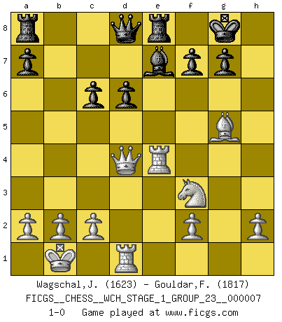 Last move : 1-0 2010 January 14 22:19:57 [Event "FICGS__CHESS__WCH_STAGE_1_GROUP_23__000007"] [Site "FICGS"] [Date "2009.11.02"] [Round "1"] [White "Wagschal,Jean-Philippe"] [Black "Gouldar,Frances"] [Result "1-0"] [WhiteElo "1623"] [BlackElo "1817"] 1.e4 e5 2.Nf3 Nc6 3.Bb5 d6 4.d4 exd4 5.Qxd4 Bd7 6.Bxc6 Bxc6 7.Nc3 Nf6 8.Bg5 Be7 9.O-O-O O-O 10.Rhe1 Re8 11.Kb1 h6 12.Bc1 Ng4 13.Nd5 Bxd5 14.exd5 Nf6 15.g4 c6 16.dxc6 bxc6 17.g5 hxg5 18.Bxg5 Ne4 19.Rxe4 1-0 Ruy Lopez : Old Steinitz defense Queenside Castling by player White (move 9) Kingside Castling by player Black (move 9) Player White won this chess game. Follow this game move after move (download)Chess is war over the board. The object is to crush the opponents mind. (Bobby Fischer) Wir können eben der zündenden Macht des Opfers nicht wiederstehen, denn die Begeisterung für das Opfer liegt in der Natur des Menschen. (Rudolf Spielmann) Realmente no sabemos como el juego fue inventado, aunque hay sospechas. Tan pronto como descubramos a los culpables, se los haremos saber. (Bruce Pandolfini) À la honte des hommes, on sait que les lois du jeu sont les seules qui soient partout justes, claires, inviolables et exécutées. Pourquoi l'Indien qui a donné les règles du jeu d'échecs est-il obéi de bon gré dans toute la terre, et que les décrétales des papes, par exemple, sont aujourd'hui un objet d'horreur et de mépris ? C'est que l'inventeur des échecs combina tout avec justesse pour la satisfaction des joueurs, et que les papes, dans leurs décrétales, n'eurent en vue que leur seul avantage. L'Indien voulut exercer également l'esprit des hommes et leur donner du plaisir; les papes ont voulu abrutir l'esprit des hommes. Voltaire (Dictionnaire philosophique / Garnier 1967) If only people were all showed a certain minimum level of niceness; if only people didn't retract verbal draw offers (without draw box ticked) on ficgs; if only people didn't kill; if only people didn't run concentration / extermination camps, if only people didn't drop nuclear bombs on Hiroshima and Nagasaki, and so on - it would be a much more beautiful world. But sadly, things are not so... (Normajean Yates)