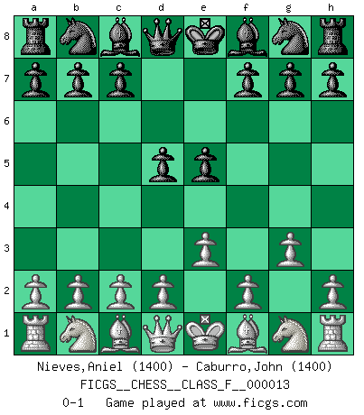 Last move : 0-1 2006 November 12 4:12:25 [Event "FICGS__CHESS__CLASS_F__000013"] [Site "FICGS"] [Date "2006.10.02"] [Round "1"] [White "Nieves,Aniel"] [Black "Caburro,John"] [Result "0-1"] [WhiteElo "1400"] [BlackElo "1400"] 1.g3 d5 2.e3 e5 0-1 This chess game has been lost on time (started : 2006.10.02 14:57:19) Benko's Opening Player Black won this chess game. Follow this game move after move (download)Good offense and good defense both begin with good development. (Bruce A. Moon) Besser ein falscher Plan, logisch durchgeführt, als gar kein Plan. (Viktor Kortschnoi) El arma más poderosa en el Ajedrez, es tener la próxima movida. (David Bronstein) Avant la finale, les dieux ont créé le milieu de partie. (Tarrasch) The worth of a book is to be measured by what you can carry away from it. (James Bryce)