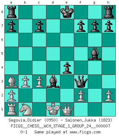 Last move : 0-1 2009 December 11 3:49:44 [Event "FICGS__CHESS__WCH_STAGE_1_GROUP_24__000007"] [Site "FICGS"] [Date "2009.11.02"] [Round "1"] [White "Segovia,Didier"] [Black "Salonen,Jukka"] [Result "0-1"] [WhiteElo "0950"] [BlackElo "1823"] 1.e4 e5 2.Nf3 Nc6 3.c3 d5 4.Bb5 dxe4 5.Nxe5 Qg5 6.Bxc6+ bxc6 7.Nxc6 Qxg2 8.Rf1 Ba6 9.d3 Bxd3 10.Kd2 Bxf1 11.Qe1 Ne7 12.Nxe7 Bxe7 13.b3 Bd3 14.Ba3 Bg5+ 15.Kd1 Qf3+ 0-1 Ponziani Opening Player Black won this chess game. Follow this game move after move (download)A player surprised is half beaten. (Proverb) Kann Schach nicht schließlich das Nationalspiel der Deutschen werden? Und welche weiteren Ausblicke bieten sich dann dar! Welche Hebung des allgemeinen Kultur-Niveaus, ja der Moral, wenn das Schachbrett den Kartentisch verdrängen würde! Wahrlich, ein Ziel, des Schweißes der Edlen wert! (Siegbert Tarrasch) Yo nunca en mi vida he jugado la Defensa Francesa, que viene siendo la más aburrida de todas las Aperturas. (Wilhelm Steinitz) Les échecs, c'est l'imagination. (David Bronstein) When you don't know what to do, walk fast and look worried. (Anonymous)