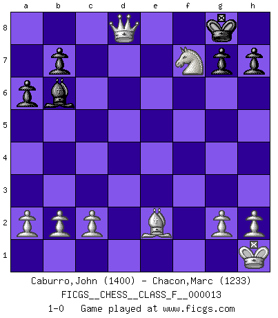 Last move : 1-0 2006 October 10 8:54:17 [Event "FICGS__CHESS__CLASS_F__000013"] [Site "FICGS"] [Date "2006.10.02"] [Round "1"] [White "Caburro,John"] [Black "Chacon,Marc"] [Result "1-0"] [WhiteElo "1400"] [BlackElo "1233"] 1.e4 c5 2.Nf3 d6 3.d4 cxd4 4.Nxd4 Nf6 5.Nc3 a6 6.Be2 e5 7.Nb3 Be6 8.O-O Nbd7 9.Be3 Be7 10.f4 exf4 11.Bxf4 O-O 12.Kh1 Ne5 13.Nd5 Nxd5 14.exd5 Bd7 15.Bxe5 dxe5 16.d6 Bg5 17.Qd5 Re8 18.Qxf7+ Kh8 19.Nc5 Rf8 20.Qxf8+ Qxf8 21.Rxf8+ Rxf8 22.Nxd7 Rf2 23.Rf1 Be3 24.Rxf2 Bxf2 25.Nxe5 Bd4 26.d7 Bb6 27.Nf7+ Kg8 28.d8Q+ 1-0 Sicilian : Najdorf, Opovcensky variation Kingside Castling by player White (move 8) Kingside Castling by player Black (move 11) Promotion Queen by player White (move 28) Player White won this chess game. Follow this game move after move (download)Modern Chess is too much concerned with things like Pawn structure. Forget it, Checkmate ends the game. (Nigel Short) Ich suche im Schach immer etwas Eigenes. Riskantes Spiel im Stile schachlicher Musketiere ist nicht meine Sache, auch wenn es vielen Freunden scharfer Wendungen gefällt. (Anatoly Karpov) La mitad de las variaciones que son calculadas en una partida de torneo, resultan ser completamente superfluas. Desafortunadamente, nadie sabe por adelantado cual mitad. (Jan Tinman) Dieu déplace le joueur, et celui-ci la pièce. Quel Dieu derrière Dieu commence donc la trame ? Arturo Perez-Reverte (prix de littérature policière 1993). All battles are fought by scared men who'd rather be someplace else. (John Wayne in the movie In harm's way)