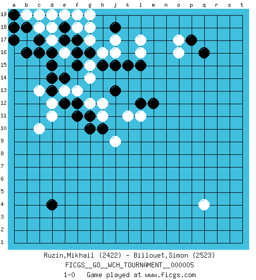 Last move : 1-0 2010 March 31 10:43:20 [Event "FICGS__GO__WCH_TOURNAMENT__000005"] [Site "FICGS"] [Date "2009.11.02"] [Round "1"] [Black "Ruzin,Mikhail"] [White "Billouet,Simon"] [Result "1-0"] [Rating 1 "2422"] [Rating 2 "2523"] 1.q16 d17 2.d4 q4 3.d15 c13 4.e14 g17 5.c17 c18 6.c16 c10 7.e18 d18 8.e17 e16 9.d16 e19 10.f16 f18 11.f17 g18 12.b18 b19 13.d19 c19 14.a18 b17 15.b16 l17 16.g16 h16 17.h15 j16 18.f19 g19 19.a17 f19 20.a19 d19 21.j18 j17 22.j15 g15 23.f15 g14 24.f12 g12 25.g11 h12 26.k15 l16 27.j13 h11 28.g10 f13 29.e12 e13 30.d13 d12 31.d14 d11 32.f11 k11 33.l15 o17 34.p17 o16 35.l12 l11 36.m12 j9 37.h10 1-0 This go game has been lost on time (started : 2009.11.02 23:2:34) Here are the names of the openings (joseki) played in the four corners : Corner d16 : d17 d15 Komoku (Somok, Xiao~mu`) 3-4 Point. The komoku (3-4) point is the traditional corner enclosure move.. Ikken Takagakari (Hankan Nop'dakeolch'im, Yi Gaogua`jiao~, 1-Space High Approach). The 5-4 approach move has become more popular in modern times, as modern Go emphasizes speed and influence. Corner q16 : q16 l17 Hoshi (Hwajeom, Seongjeom, Xingwei`) 4-4 Point. The star or hoshi (4-4) point, emphasizing influence at the potential expense of territory. Corner d4 : d4 j9 Hoshi (Hwajeom, Seongjeom, Xingwei`) 4-4 Point. The star or hoshi (4-4) point, emphasizing influence at the potential expense of territory. Player Black won this Go (weiqi, baduk) game. Follow this game move after move (download)Don't make compact groups of stones. (Anonymous) Secret operations are essential in war; upon them the army relies to make its every move. (Sun Tzu)