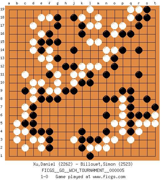 Last move : 1-0 2010 February 28 21:31:25 [Event "FICGS__GO__WCH_TOURNAMENT__000005"] [Site "FICGS"] [Date "2009.11.02"] [Round "1"] [Black "Xu,Daniel"] [White "Billouet,Simon"] [Result "1-0"] [Rating 1 "2262"] [Rating 2 "2523"] 1.q16 d17 2.d4 q3 3.q5 r5 4.r6 r4 5.q7 o3 6.r11 c6 7.f3 c11 8.k17 l15 9.g17 l17 10.l18 m17 11.k16 n14 12.r14 d15 13.g15 q18 14.r17 m18 15.c9 c4 16.c3 b3 17.c5 b4 18.d5 b5 19.d6 c7 20.d7 d3 21.k4 d8 22.e8 d9 23.e9 d10 24.n4 n3 25.m3 m2 26.k10 g10 27.f11 g11 28.h9 g9 29.g8 e10 30.l3 l2 31.k2 j3 32.k3 p5 33.n6 o5 34.e14 d14 35.n16 m15 36.r18 k18 37.j18 l19 38.n11 p7 39.q8 p8 40.n8 e3 41.f4 f18 42.g18 e18 43.j14 p17 44.p16 o17 45.s6 f12 46.f2 e13 47.q9 s5 48.p9 t6 49.t7 t5 50.s8 e2 51.o13 l12 52.l11 m12 53.l1 n2 54.e4 c2 55.g13 k12 56.j12 j11 57.h12 k11 58.l10 j10 59.j9 r19 60.s19 q19 61.s18 f9 62.f8 o14 63.p14 n13 64.o12 o16 65.e15 e16 66.f16 f14 67.f15 f13 68.q4 p4 69.q6 p6 70.o8 1-0 This go game has been lost on time (started : 2009.11.02 23:2:34) Here are the names of the openings (joseki) played in the four corners : Corner q4 : q3 q5 Komoku (Somok, Xiao~mu`) 3-4 Point. The komoku (3-4) point is the traditional corner enclosure move.. Ikken Takagakari (Hankan Nop'dakeolch'im, Yi Gaogua`jiao~, 1-Space High Approach). The 5-4 approach move has become more popular in modern times, as modern Go emphasizes speed and influence. Corner d4 : d4 c6 Hoshi (Hwajeom, Seongjeom, Xingwei`) 4-4 Point. The star or hoshi (4-4) point, emphasizing influence at the potential expense of territory. Ikken Kakari (Hankan Keolch'im, Yi Gua`jiao~, 1-Space Low Approach). White 2 is the standard approach move to the 4-4. Player Black won this Go (weiqi, baduk) game. Follow this game move after move (download)Proverbs do not apply to White. (Tero Sand) Coffee just isn't my cup of tea. (Unknown)