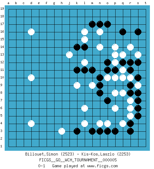 Last move : 0-1 2010 February 25 21:21:30 [Event "FICGS__GO__WCH_TOURNAMENT__000005"] [Site "FICGS"] [Date "2009.11.02"] [Round "1"] [Black "Billouet,Simon"] [White "Kis-Kos,Laszlo"] [Result "0-1"] [Rating 1 "2523"] [Rating 2 "2253"] 1.q16 d4 2.r4 d16 3.o3 r10 4.r8 r14 5.r12 p14 6.o17 q11 7.s16 d10 8.q12 p12 9.p11 q13 10.s12 s13 11.o12 p13 12.s10 p10 13.o11 s9 14.r11 q10 15.r9 o10 16.m11 n14 17.n10 p8 18.n8 r7 19.s8 p6 20.o7 q8 21.s7 r6 22.s6 q4 23.r3 o4 24.p3 r5 25.s5 n4 26.n3 l4 27.m3 l6 28.k3 m9 29.n9 k9 30.k11 l12 31.l11 h3 32.l14 n16 33.n17 l16 34.m17 l15 35.k14 j13 0-1 This go game has been lost on time (started : 2009.11.02 23:2:34) Here are the names of the openings (joseki) played in the four corners : Corner q16 : q16 r14 Hoshi (Hwajeom, Seongjeom, Xingwei`) 4-4 Point. The star or hoshi (4-4) point, emphasizing influence at the potential expense of territory. Ikken Kakari (Hankan Keolch'im, Yi Gua`jiao~, 1-Space Low Approach). White 2 is the standard approach move to the 4-4. Player White won this Go (weiqi, baduk) game. Follow this game move after move (download)If you have won four corners, resign. (Anonymous) Memory is a crazy woman that hoards colored rags and throws away food. (Austin O'Malley)