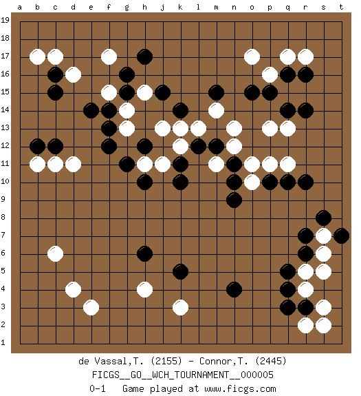 Last move : 0-1 2010 February 8 1:11:45 [Event "FICGS__GO__WCH_TOURNAMENT__000005"] [Site "FICGS"] [Date "2009.11.02"] [Round "1"] [Black "de Vassal,Thibault"] [White "Connor,Thomas"] [Result "0-1"] [Rating 1 "2155"] [Rating 2 "2445"] 1.q4 d16 2.q16 d4 3.q10 o17 4.o15 r17 5.r16 q17 6.n10 k3 7.n4 c6 8.m15 r4 9.q5 r5 10.r3 s3 11.r6 s6 12.r7 s7 13.s8 r2 14.q3 s2 15.t7 s5 16.k10 e3 17.k5 h4 18.h6 f17 19.j15 p16 20.p15 d11 21.c16 c17 22.c15 b17 23.c12 c11 24.b12 b11 25.e14 g14 26.f13 g13 27.f12 j13 28.h17 l13 29.k14 k13 30.g11 n13 31.g15 f15 32.f14 p13 33.q14 q13 34.r14 o11 35.n11 n12 36.k11 o10 37.n9 q11 38.p10 p11 39.r10 h15 40.g16 h11 41.h10 j11 42.h12 m14 43.m12 m11 44.l12 k12 0-1 Comment by player 1 : Thibault de Vassal : k12 was really, really bad... the way is so long :) thanks for the game! Here are the names of the openings (joseki) played in the four corners : Corner q16 : q16 o17 Hoshi (Hwajeom, Seongjeom, Xingwei`) 4-4 Point. The star or hoshi (4-4) point, emphasizing influence at the potential expense of territory. Ikken Kakari (Hankan Keolch'im, Yi Gua`jiao~, 1-Space Low Approach). White 2 is the standard approach move to the 4-4. Player White won this Go (weiqi, baduk) game. Follow this game move after move (download)Big groups never die. (Anonymous) But they are useless. They can only give you answers. (Pablo Picasso, about computers)
