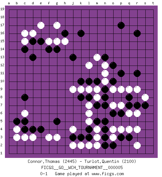 Last move : 0-1 2010 January 15 10:6:6 [Event "FICGS__GO__WCH_TOURNAMENT__000005"] [Site "FICGS"] [Date "2009.11.02"] [Round "1"] [Black "Connor,Thomas"] [White "Turlot,Quentin"] [Result "0-1"] [Rating 1 "2445"] [Rating 2 "2100"] 1.r16 e17 2.d4 p4 3.p17 r9 4.d15 d16 5.e15 c15 6.c14 c16 7.d13 c6 8.c8 c3 9.c4 d3 10.e4 b4 11.b5 b3 12.c5 f3 13.g5 g3 14.r11 r4 15.k16 g17 16.h16 f15 17.f14 g15 18.g14 h15 19.j13 p9 20.p11 j4 21.n3 o3 22.n5 l6 23.l3 m2 24.n2 m4 25.n4 m3 26.m5 l5 27.q3 q4 28.n7 m8 29.n8 m9 30.n9 n10 31.m7 l7 32.o10 o9 33.m10 n11 34.l10 k9 35.q8 q9 36.r7 p7 37.p6 q6 38.q7 o7 39.o6 r6 40.s7 s8 41.p3 o4 42.o2 r2 43.o12 n12 44.n13 l12 45.k10 m13 46.l4 l2 47.l8 l9 48.k8 j9 49.k3 k2 50.j3 j2 0-1 Here are the names of the openings (joseki) played in the four corners : Corner d16 : e17 d15 Mokuhazushi (Waemok, Wai`mu`) 5-3 Point. The mokuhazushi (5-3) point was popular in the Edo period in Japan (1600 - 1867). It emphasizes influence; territorially, it is inferior to the 3-4 point. Takamoku Kakari. Black prevents White from gaining influence, but in the local context, abandoning profit in the corner entails a loss. White 3-4 and 4-4 are best. Corner d4 : d4 c6 Hoshi (Hwajeom, Seongjeom, Xingwei`) 4-4 Point. The star or hoshi (4-4) point, emphasizing influence at the potential expense of territory. Ikken Kakari (Hankan Keolch'im, Yi Gua`jiao~, 1-Space Low Approach). White 2 is the standard approach move to the 4-4. Player White won this Go (weiqi, baduk) game. Follow this game move after move (download)Win the early ko to win the game. (Anonymous) 98% of all statistics are made up. (Author unknown)