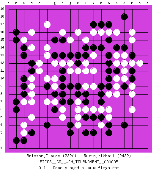 Last move : 0-1 2010 April 12 12:50:56 [Event "FICGS__GO__WCH_TOURNAMENT__000005"] [Site "FICGS"] [Date "2009.11.02"] [Round "1"] [Black "Brisson,Claude"] [White "Ruzin,Mikhail"] [Result "0-1"] [Rating 1 "2220"] [Rating 2 "2422"] 1.q4 d16 2.c14 f17 3.d3 r16 4.c8 r6 5.o3 q10 6.o17 p16 7.q18 o16 8.n17 n16 9.m17 k16 10.r10 r9 11.q9 r8 12.r11 q11 13.q12 r12 14.p11 p10 15.r13 s12 16.j4 d5 17.f4 c3 18.c2 c4 19.b2 d7 20.b6 c7 21.b7 d8 22.c9 d9 23.c10 d10 24.d11 e11 25.d12 e12 26.b16 c15 27.b15 d14 28.c13 k7 29.o10 p9 30.o9 p8 31.o12 p13 32.o13 p12 33.o11 l11 34.p14 q13 35.q14 q12 36.m14 m16 37.n7 o8 38.n8 m9 39.n9 o14 40.o15 m13 41.n14 o5 42.n5 n4 43.o4 n6 44.m5 m6 45.l5 o6 46.l8 l9 47.l7 l6 48.k8 k5 49.m3 k4 50.j7 k6 51.l3 j8 52.k9 m11 53.l13 l15 54.k12 k11 55.j9 j11 56.h8 h6 57.f9 f10 58.g6 h5 59.j3 g7 60.h10 g9 61.h11 j12 62.j13 h12 63.h13 g12 64.g8 f7 65.h7 g10 66.h9 l12 67.k13 r15 68.l14 j15 69.g13 f13 70.h15 h16 71.g15 f14 0-1 Here are the names of the openings (joseki) played in the four corners : Corner d16 : d16 c14 Hoshi (Hwajeom, Seongjeom, Xingwei`) 4-4 Point. The star or hoshi (4-4) point, emphasizing influence at the potential expense of territory. Ikken Kakari (Hankan Keolch'im, Yi Gua`jiao~, 1-Space Low Approach). Black 2 is the standard approach move to the 4-4. Corner q4 : q4 r6 Hoshi (Hwajeom, Seongjeom, Xingwei`) 4-4 Point. The star or hoshi (4-4) point, emphasizing influence at the potential expense of territory. Ikken Kakari (Hankan Keolch'im, Yi Gua`jiao~, 1-Space Low Approach). White 2 is the standard approach move to the 4-4. Corner q16 : r16 o17 Komoku (Somok, Xiao~mu`) 3-4 Point. The komoku (3-4) point is the traditional corner enclosure move.. Niken Kakari (Dukan Keolch'im, E`r Gua`jiao~, 2-Space Low Approach). Black 2 is used with friendly forces backing it up. Its purpose is to prevent a pincer. Locally it results in a loss, but may be appropriate fuseki strategy. It was popular in the late 1950s and early 1960s, but is not seen often nowadays, having been replaced by the one-space high approach, with which it has points in common. Player White won this Go (weiqi, baduk) game. Follow this game move after move (download)To reduce an opponent's large prospective territory, strike at the shoulder. (Anonymous) Knowledge rests not upon truth alone, but upon error also. (Carl G. Jung)