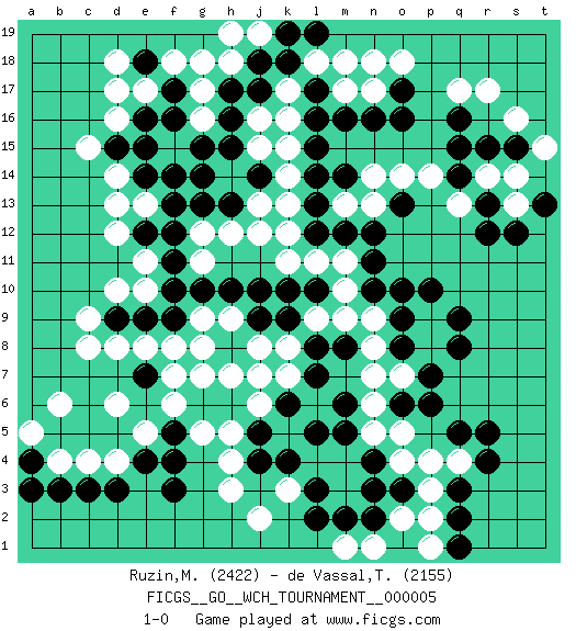 Last move : 1-0 2010 July 23 11:5:42 [Event "FICGS__GO__WCH_TOURNAMENT__000005"] [Site "FICGS"] [Date "2009.11.02"] [Round "1"] [Black "Ruzin,Mikhail"] [White "de Vassal,Thibault"] [Result "1-0"] [Rating 1 "2422"] [Rating 2 "2155"] 1.q16 d4 2.q3 d16 3.q9 d10 4.k4 k16 5.f3 d6 6.r5 n17 7.f17 e17 8.f16 d14 9.j17 j16 10.h17 k17 11.e18 d18 12.e16 d17 13.f13 e13 14.f12 n7 15.o6 o7 16.p7 n6 17.n4 o5 18.p6 n5 19.k6 n9 20.o10 m10 21.k10 l11 22.n12 r14 23.l13 k11 24.j10 j12 25.j14 h12 26.g10 h14 27.h15 j15 28.g14 k14 29.h13 k13 30.r12 p14 31.o16 n14 32.n16 m17 33.m14 n13 34.m16 s16 35.l15 k15 36.o17 r17 37.l17 l18 38.l16 n18 39.m12 m13 40.l12 k12 41.o13 o14 42.l14 o18 43.r15 q17 44.s15 s14 45.q14 q13 46.q15 t15 47.r13 c8 48.c3 c4 49.d3 s13 50.s12 o4 51.n3 q4 52.r4 p3 53.q5 p2 54.e4 e5 55.f5 f6 56.g6 g5 57.f4 g7 58.h6 f8 59.e7 f7 60.e9 e8 61.d9 e10 62.f9 c9 63.b3 b4 64.a4 a5 65.a3 b6 66.e12 d12 67.e14 d13 68.t13 p8 69.q8 p9 70.p10 j8 71.h8 h7 72.j7 k8 73.f10 g11 74.f11 g18 75.j18 f18 76.k18 g12 77.l10 m11 78.l8 k7 79.l7 j6 80.l5 l9 81.k9 m9 82.d15 c15 83.j9 j7 84.e15 g17 85.h16 g16 86.g15 h5 87.l19 m18 88.g13 j13 89.h10 g8 90.m8 n8 91.o9 h3 92.o3 p4 93.q2 m1 94.m2 n1 95.o1 o2 96.n2 p1 97.l2 j2 98.j4 h4 99.j5 k3 100.l3 h18 101.m5 j19 102.q1 h19 103.k19 f15 104.f14 g9 105.n11 h9 106.o8 e11 107.m6 d8 108.n10 1-0 Here are the names of the openings (joseki) played in the four corners : Corner d4 : d4 f3 Hoshi (Hwajeom, Seongjeom, Xingwei`) 4-4 Point. The star or hoshi (4-4) point, emphasizing influence at the potential expense of territory. Ikken Kakari (Hankan Keolch'im, Yi Gua`jiao~, 1-Space Low Approach). Black 2 is the standard approach move to the 4-4. Corner q16 : q16 n17 Hoshi (Hwajeom, Seongjeom, Xingwei`) 4-4 Point. The star or hoshi (4-4) point, emphasizing influence at the potential expense of territory. Niken Kakari (Dukan Keolch'im, E`r Gua`jiao~, 2-Space Low Approach). Black typically answers by 7-3 or 3-5 (which is not joseki). Corner d16 : d16 f17 Hoshi (Hwajeom, Seongjeom, Xingwei`) 4-4 Point. The star or hoshi (4-4) point, emphasizing influence at the potential expense of territory. Ikken Kakari (Hankan Keolch'im, Yi Gua`jiao~, 1-Space Low Approach). Black 2 is the standard approach move to the 4-4. Player Black won this Go (weiqi, baduk) game. Follow this game move after move (download)If there is no stone on the handicap point, the carpenter's square is dead. (Anonymous) Before all elsed, be armed. (Niccolo Machiavelli)
