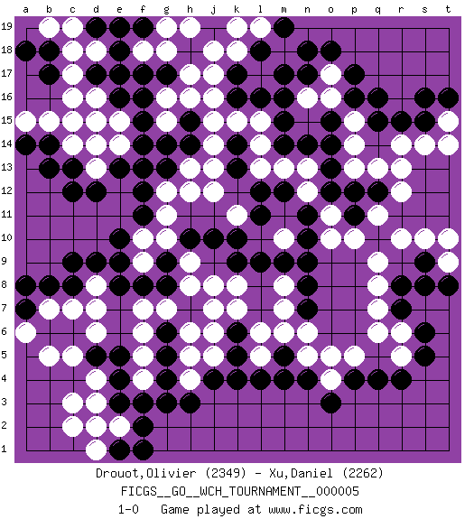 Last move : 1-0 2009 December 17 3:22:41 [Event "FICGS__GO__WCH_TOURNAMENT__000005"] [Site "FICGS"] [Date "2009.11.02"] [Round "1"] [Black "Drouot,Olivier"] [White "Xu,Daniel"] [Result "1-0"] [Rating 1 "2349"] [Rating 2 "2262"] 1.q16 d4 2.p4 d16 3.f3 d6 4.k4 q9 5.r4 r13 6.r15 p13 7.n17 r6 8.c8 d8 9.d9 c7 10.e8 d7 11.c9 f6 12.g4 c14 13.c12 h17 14.r8 q8 15.r7 q7 16.s6 q6 17.s8 s10 18.n4 l17 19.e18 d18 20.d17 c17 21.e17 c18 22.e16 d15 23.g17 h16 24.f14 o17 25.p17 o16 26.o18 n16 27.n18 h13 28.e13 f9 29.f8 h9 30.g9 g10 31.g8 h8 32.h10 f10 33.e9 g12 34.h14 j14 35.j10 k8 36.k9 k7 37.h15 j15 38.m9 n5 39.m4 m7 40.n7 m8 41.n9 l6 42.l12 j12 43.n8 n6 44.h7 j8 45.o12 k11 46.l11 o10 47.o13 p14 48.n10 o11 49.n11 m13 50.p12 q11 51.q12 r12 52.o14 p15 53.m15 l14 54.m16 r14 55.n14 n12 56.k14 l15 57.k13 k15 58.k10 j13 59.m12 p5 60.l9 m10 61.f12 g11 62.m17 n13 63.k17 g16 64.f15 g18 65.c13 j17 66.d2 c3 67.q4 c2 68.l16 k18 69.l18 j18 70.f17 h19 71.b8 b7 72.a7 a6 73.a8 b5 74.b14 b15 75.b13 a15 76.p16 k19 77.o15 s14 78.s15 t15 79.t16 t14 80.s16 e2 81.e3 d3 82.f2 d1 83.p11 p10 84.d14 c15 85.d19 c19 86.f19 g19 87.s9 r10 88.k16 j16 89.m5 m6 90.e5 j5 91.j4 f5 92.e4 h5 93.d5 c5 94.f1 h4 95.h3 g7 96.m14 l13 97.g6 f7 98.g5 h6 99.k5 j7 100.e10 r5 101.s5 o4 102.o3 o5 103.g13 g15 104.g14 l5 105.l4 e15 106.f16 e14 107.f11 h12 108.f13 d13 109.d12 f4 110.g3 t9 111.t8 t10 112.e1 d2 113.k6 j6 114.a14 f18 115.e19 l19 116.m19 q13 117.q15 d14 118.b17 c16 119.b18 b19 120.a18 1-0 Here are the names of the openings (joseki) played in the four corners : Corner d4 : d4 f3 Hoshi (Hwajeom, Seongjeom, Xingwei`) 4-4 Point. The star or hoshi (4-4) point, emphasizing influence at the potential expense of territory. Ikken Kakari (Hankan Keolch'im, Yi Gua`jiao~, 1-Space Low Approach). Black 2 is the standard approach move to the 4-4. Corner q4 : p4 q9 Takamoku (Gomok, Gaomu`) 5-4 Point. The takamoku (high) point (5-4). With its emphasis on influence, the 5-4 point complements the 4-4 (hoshi) point in creating an influence-oriented fuseki. Corner q16 : q16 r13 Hoshi (Hwajeom, Seongjeom, Xingwei`) 4-4 Point. The star or hoshi (4-4) point, emphasizing influence at the potential expense of territory. Nikken Kakari (Dukan Keolch'im, E`r Gua`jiao~, 2-Space Low Approach). Black typically answers by 7-3 or 3-5 (which is not joseki). Player Black won this Go (weiqi, baduk) game. Follow this game move after move (download)Win the early ko to win the game. (Anonymous) The good fighters of old first put themselves beyond the possibility of defeat, and then waited for an opportunity of defeating the enemy. (Sun Tzu)