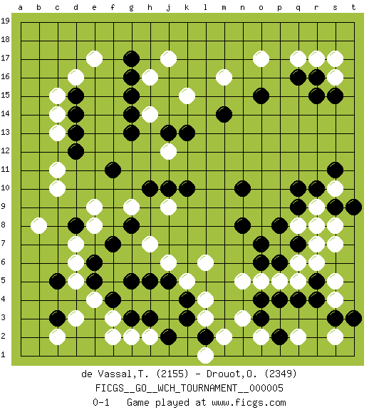 Last move : 0-1 2010 January 19 11:17:1 [Event "FICGS__GO__WCH_TOURNAMENT__000005"] [Site "FICGS"] [Date "2009.11.02"] [Round "1"] [Black "de Vassal,Thibault"] [White "Drouot,Olivier"] [Result "0-1"] [Rating 1 "2155"] [Rating 2 "2349"] 1.q4 d16 2.q16 e4 3.c5 d3 4.d8 c10 5.q10 o17 6.o15 m16 7.m14 k15 8.k3 b8 9.g3 d6 10.k10 l4 11.k4 l6 12.n10 l3 13.g5 k5 14.j5 j6 15.h5 h7 16.g17 j17 17.g15 e17 18.g13 r17 19.r16 q17 20.k13 h14 21.g14 r6 22.r5 q6 23.o4 p5 24.p4 n5 25.r8 j12 26.d14 c14 27.d15 c15 28.d13 c13 29.d12 c11 30.j13 h16 31.h10 e9 32.f11 h2 33.j2 g2 34.h3 f3 35.l2 n3 36.o3 m2 37.f4 f2 38.e5 d5 39.g16 l1 40.f7 e8 41.c3 c2 42.g8 j9 43.j10 g9 44.e6 d7 45.p6 p7 46.o6 o5 47.o7 q5 48.q7 s4 49.r4 s5 50.s3 s16 51.s15 s17 52.r15 s8 53.s9 s7 54.n8 s10 55.t9 q8 56.p8 r9 57.r10 r7 58.q9 r8 59.s11 o2 60.p2 s2 61.t3 q2 0-1 Here are the names of the openings (joseki) played in the four corners : Corner d4 : e4 c5 Takamoku (Gomok, Gaomu`) 5-4 Point. The takamoku (high) point (5-4). With its emphasis on influence, the 5-4 point complements the 4-4 (hoshi) point in creating an influence-oriented fuseki. Corner q16 : q16 o17 Hoshi (Hwajeom, Seongjeom, Xingwei`) 4-4 Point. The star or hoshi (4-4) point, emphasizing influence at the potential expense of territory. Ikken Kakari (Hankan Keolch'im, Yi Gua`jiao~, 1-Space Low Approach). White 2 is the standard approach move to the 4-4. Corner q4 : q4 l4 Hoshi (Hwajeom, Seongjeom, Xingwei`) 4-4 Point. The star or hoshi (4-4) point, emphasizing influence at the potential expense of territory. Corner d16 : d16 g17 Hoshi (Hwajeom, Seongjeom, Xingwei`) 4-4 Point. The star or hoshi (4-4) point, emphasizing influence at the potential expense of territory. Nikken Kakari (Dukan Keolch'im, E`r Gua`jiao~, 2-Space Low Approach). White typically answers by 7-3 or 3-5 (which is not joseki). Player White won this Go (weiqi, baduk) game. Follow this game move after move (download)Stop on second, extend on third. (Anonymous) Memory is a complicated thing, a relative to truth, but not its twin. (Barbara Kingsolver, Animal Dreams)