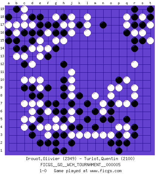 Last move : 1-0 2009 November 25 10:8:58 [Event "FICGS__GO__WCH_TOURNAMENT__000005"] [Site "FICGS"] [Date "2009.11.02"] [Round "1"] [Black "Drouot,Olivier"] [White "Turlot,Quentin"] [Result "1-0"] [Rating 1 "2349"] [Rating 2 "2100"] 1.q16 f4 2.p3 d14 3.h3 c4 4.c9 c7 5.c12 d17 6.b14 l16 7.n17 l18 8.r4 r9 9.r7 r12 10.r14 k3 11.h5 n3 12.f2 g2 13.g3 f3 14.e2 h2 15.j2 j3 16.h1 h4 17.g1 g4 18.j4 j5 19.k4 l3 20.l5 j6 21.l7 p2 22.o2 o3 23.q2 p4 24.p1 q3 25.p2 q4 26.r3 p7 27.m4 m3 28.q8 o9 29.p10 p9 30.q9 q10 31.p8 o8 32.o7 n7 33.o6 n6 34.n5 q7 35.o5 r8 36.q5 m8 37.m6 c15 38.b15 b17 39.d4 d5 40.d3 c5 41.k17 l17 42.f17 g15 43.f15 f14 44.g14 h15 45.e14 e15 46.f13 f16 47.e16 f14 48.d16 e13 49.c16 c17 50.e17 b16 51.d18 c18 52.e18 g18 53.g17 h17 54.h18 j18 55.h16 j17 56.g16 j16 57.f15 e14 58.b19 c19 59.a16 a17 60.a15 b13 61.c14 c13 62.d15 f16 63.a18 d12 64.f9 j8 65.h8 j9 66.e5 f6 67.e6 e7 68.f7 d6 69.e8 d7 70.g7 e4 71.g6 g5 72.j7 k7 73.h6 h7 74.h9 j10 75.j7 h2 76.g2 h7 77.h10 d10 78.d9 e10 79.j7 q17 80.r17 e9 81.d8 c10 82.k6 h7 83.h12 j11 84.j7 r16 85.k8 s16 86.s17 s18 87.r18 q18 88.t18 s19 89.r19 t17 90.t16 t15 91.r15 t17 92.t19 s18 93.s15 1-0 Here are the names of the openings (joseki) played in the four corners : Corner d4 : f4 h3 Ootakamoku (Chaogao) 6-4 Point. The large takamoku (high) point (6-4), experimented with during the "new fuseki" movement in Japan in the 1930's. This point is seldom played as the initial corner point nowadays. Corner d16 : d14 c12 Ootakamoku (Chaogao) 6-4 Point. The large takamoku (high) point (6-4), experimented with during the "new fuseki" movement in Japan in the 1930's. This point is seldom played as the initial corner point nowadays. Corner q16 : q16 l16 Hoshi (Hwajeom, Seongjeom, Xingwei`) 4-4 Point. The star or hoshi (4-4) point, emphasizing influence at the potential expense of territory. Player Black won this Go (weiqi, baduk) game. Follow this game move after move (download)You have to like to win, and to learn to recognize the errors that gave you the victory. (Pierre Audouard) If things go wrong, don't go with them. (Roger Babson)