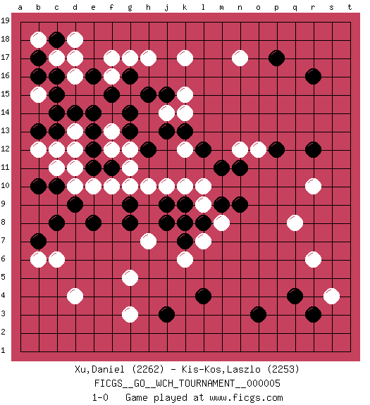 Last move : 1-0 2010 January 19 13:1:58 [Event "FICGS__GO__WCH_TOURNAMENT__000005"] [Site "FICGS"] [Date "2009.11.02"] [Round "1"] [Black "Xu,Daniel"] [White "Kis-Kos,Laszlo"] [Result "1-0"] [Rating 1 "2262"] [Rating 2 "2253"] 1.r16 d4 2.q4 d16 3.p17 r10 4.r12 r6 5.o3 s4 6.r3 q8 7.p12 k17 8.c14 c12 9.e14 f16 10.b16 c17 11.b17 d10 12.c18 d18 13.c16 d17 14.c8 c6 15.e8 f10 16.b10 d13 17.d14 b18 18.g14 n17 19.e12 c11 20.g8 h10 21.h15 h17 22.b7 b6 23.j3 g3 24.l4 g5 25.j8 g12 26.e13 j14 27.j15 k15 28.b13 b12 29.c13 d12 30.e11 e10 31.g16 g17 32.f15 k6 33.c10 d11 34.d9 b15 35.c15 f13 36.e16 f17 37.g13 f12 38.j13 k14 39.h12 k10 40.f11 g11 41.g9 g10 42.l12 n12 43.m11 l9 44.n11 o12 45.n9 h7 46.j9 j10 47.l8 m8 48.m9 k8 49.k9 l10 50.k7 l7 51.k8 k12 52.k13 1-0 Here are the names of the openings (joseki) played in the four corners : Corner q4 : q4 r6 Hoshi (Hwajeom, Seongjeom, Xingwei`) 4-4 Point. The star or hoshi (4-4) point, emphasizing influence at the potential expense of territory. Ikken Kakari (Hankan Keolch'im, Yi Gua`jiao~, 1-Space Low Approach). White 2 is the standard approach move to the 4-4. Corner d16 : d16 c14 Hoshi (Hwajeom, Seongjeom, Xingwei`) 4-4 Point. The star or hoshi (4-4) point, emphasizing influence at the potential expense of territory. Ikken Kakari (Hankan Keolch'im, Yi Gua`jiao~, 1-Space Low Approach). Black 2 is the standard approach move to the 4-4. Corner d4 : d4 c8 Hoshi (Hwajeom, Seongjeom, Xingwei`) 4-4 Point. The star or hoshi (4-4) point, emphasizing influence at the potential expense of territory. Player Black won this Go (weiqi, baduk) game. Follow this game move after move (download)Go uses the most elemental materials and concepts - line and circle, wood and stone, black and white - combining them with simple rules to generate subtle strategies and complex tactics that stagger the imagination. (Iwamoto Kaoru, 9 dan professional Go player and former Honinbo title holder) The Movers & Shakers of this world are those who play chess in the mornings and go to the disco in the evenings. (Dinesh De Silva)