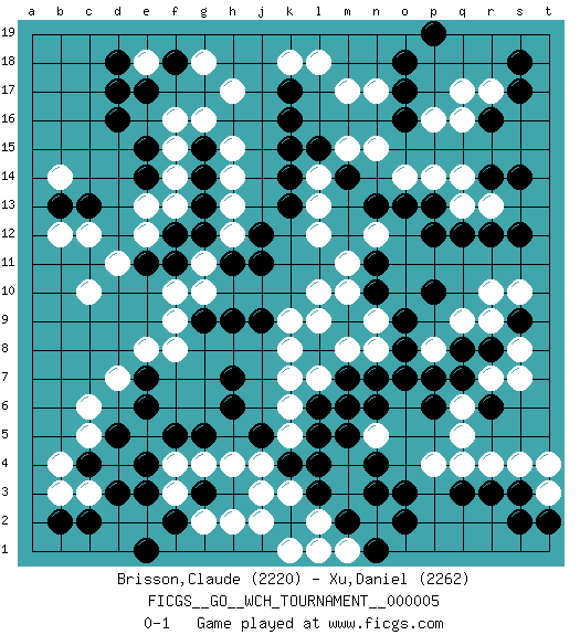 Last move : 0-1 2010 February 19 19:1:55 [Event "FICGS__GO__WCH_TOURNAMENT__000005"] [Site "FICGS"] [Date "2009.11.02"] [Round "1"] [Black "Brisson,Claude"] [White "Xu,Daniel"] [Result "0-1"] [Rating 1 "2220"] [Rating 2 "2262"] 1.d16 q4 2.o3 m3 3.r3 r4 4.q3 p4 5.o2 n5 6.r16 r10 7.d3 c10 8.k17 p16 9.r14 r17 10.s17 q17 11.s18 m17 12.k15 m15 13.c13 c6 14.s3 f16 15.d17 h17 16.k16 h15 17.k13 h13 18.p10 l12 19.j12 h12 20.j11 l10 21.m14 l14 22.k14 l13 23.l15 n15 24.n13 k9 25.h11 g11 26.h9 g10 27.j9 p14 28.p13 q13 29.p12 o14 30.n11 n9 31.r12 q14 32.q12 r13 33.s14 q9 34.s12 s4 35.g3 f8 36.h6 c3 37.c2 d4 38.e3 b3 39.m9 m10 40.o9 m8 41.o7 p8 42.o8 k7 43.g9 f9 44.h7 j3 45.e6 d7 46.l5 h2 47.l3 k5 48.l6 k6 49.n6 l2 50.k4 j4 51.j5 n12 52.o13 m4 53.l4 m6 54.m7 l7 55.m5 m11 56.l8 n8 57.n10 l9 58.n7 k8 59.g14 h14 60.g15 g16 61.g13 f13 62.f12 e13 63.g12 e12 64.f11 f10 65.e11 d11 66.r6 q6 67.q7 r7 68.r8 s7 69.q8 s8 70.p6 q5 71.s9 r9 72.p7 s10 73.n4 k3 74.m6 g2 75.f2 k1 76.m2 m1 77.n3 j2 78.o18 l18 79.p19 k18 80.o16 n17 81.o17 q16 82.n1 l1 83.e15 f15 84.e14 f14 85.f18 g18 86.e7 e8 87.d5 c5 88.e4 g4 89.g5 h4 90.c4 b4 91.b2 t3 92.t2 t4 93.s2 f4 94.f5 f3 95.e1 e18 96.d18 b12 97.b13 c12 98.e17 b14 0-1 Here are the names of the openings (joseki) played in the four corners : Corner q4 : q4 o3 Hoshi (Hwajeom, Seongjeom, Xingwei`) 4-4 Point. The star or hoshi (4-4) point, emphasizing influence at the potential expense of territory. Ikken Kakari (Hankan Keolch'im, Yi Gua`jiao~, 1-Space Low Approach). Black 2 is the standard approach move to the 4-4. Corner q16 : r16 p16 Komoku (Somok, Xiao~mu`) 3-4 Point. The komoku (3-4) point is the traditional corner enclosure move.. Ikken Takagakari (Hankan Nop'dakeolch'im, Yi Gaogua`jiao~, 1-Space High Approach). The 5-4 approach move has become more popular in modern times, as modern Go emphasizes speed and influence. Corner d4 : d3 c6 Komoku (Somok, Xiao~mu`) 3-4 Point. The komoku (3-4) point is the traditional corner enclosure move.. Nikken Kakari (Dukan Keolch'im, E`r Gua`jiao~, 2-Space Low Approach). White 2 is used with friendly forces backing it up. Its purpose is to prevent a pincer. Locally it results in a loss, but may be appropriate fuseki strategy. It was popular in the late 1950s and early 1960s, but is not seen often nowadays, having been replaced by the one-space high approach, with which it has points in common. Player White won this Go (weiqi, baduk) game. Follow this game move after move (download)Keshi is worth as much as an invasion ! (Anonymous) Art is the only way to run away without leaving home. (Twyla Tharp)