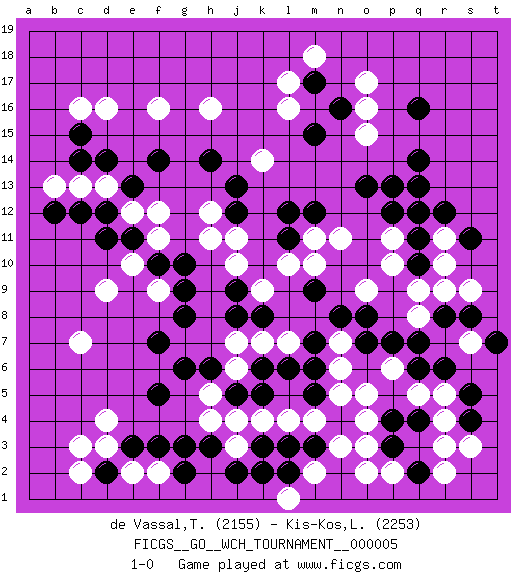 Last move : 1-0 2010 May 2 3:30:17 [Event "FICGS__GO__WCH_TOURNAMENT__000005 "] [Site "FICGS"] [Date "2009.11.02"] [Round "1"] [Black "de Vassal,Thibault "] [White "Kis-Kos,Laszlo "] [Result "1-0"] [Rating 1 "2155"] [Rating 2 "2253"] 1.q4 d16 2.q16 d4 3.q10 o3 4.q6 k4 5.m3 m4 6.l3 l4 7.k3 o5 8.g3 j3 9.j2 j4 10.h3 o17 11.m17 o15 12.q14 l16 13.o7 l17 14.d14 f16 15.d11 c7 16.c15 c16 17.p4 n3 18.d2 c3 19.o13 q12 20.p13 q8 21.p7 p10 22.q11 p11 23.p12 q9 24.r12 o9 25.m7 f2 26.f3 e2 27.e3 d3 28.g2 c2 29.p3 m2 30.l2 l1 31.k2 o2 32.f5 k7 33.m6 n6 34.m9 n11 35.f7 d9 36.g8 k9 37.n16 o16 38.m15 m18 39.m12 m11 40.l12 n7 41.n8 o4 42.l11 l10 43.o8 m10 44.m5 n5 45.g10 f9 46.g9 f11 47.f14 k14 48.h14 h16 49.f10 e10 50.e11 c13 51.c12 d13 52.c14 b13 53.b12 f12 54.e13 e12 55.d12 r5 56.r6 r3 57.q2 r2 58.s4 r4 59.s5 p2 60.k6 j6 61.k5 j7 62.j5 h5 63.h6 h4 64.g6 p6 65.q7 q5 66.r8 r9 67.s8 r11 68.q13 r10 69.q12 j11 70.j12 h12 71.j13 h11 72.j9 j10 73.j8 l7 74.l6 s9 75.s11 s7 76.t7 s3 77.k8 1-0 Here are the names of the openings (joseki) played in the four corners : Corner q4 : q4 o3Hoshi (Hwajeom, Seongjeom, Xingwei`) 4-4 Point. The star or hoshi (4-4) point, emphasizing influence at the potential expense of territory.Ikken Kakari (Hankan Keolch'im, Yi Gua`jiao~, 1-Space Low Approach). White 2 is the standard approach move to the 4-4. Corner d4 : d4 g3Hoshi (Hwajeom, Seongjeom, Xingwei`) 4-4 Point. The star or hoshi (4-4) point, emphasizing influence at the potential expense of territory.Niken Kakari (Dukan Keolch'im, E`r Gua`jiao~, 2-Space Low Approach). White typically answers by 7-3 or 3-5 (which is not joseki). Corner q16 : q16 o17Hoshi (Hwajeom, Seongjeom, Xingwei`) 4-4 Point. The star or hoshi (4-4) point, emphasizing influence at the potential expense of territory.Ikken Kakari (Hankan Keolch'im, Yi Gua`jiao~, 1-Space Low Approach). White 2 is the standard approach move to the 4-4. Corner d16 : d16 d14Hoshi (Hwajeom, Seongjeom, Xingwei`) 4-4 Point. The star or hoshi (4-4) point, emphasizing influence at the potential expense of territory.Ikken Takagakari (Hankan Nop'dakeolch'im, Yi Gaojia, 1-Space High Approach). White typically responds at 6-4 or 3-10. White 4-10 is played when White finds play on the right side advantageous. White 4-8 or 3-8 may be played when White has support at top. Player Black won this Go (weiqi, baduk) game.Follow this game move after move (download ) If you don't know ladders, don't play go. (Anonymous) Somewhere in the world there is an epigram for every dilemma. (Hendrik Willem van Loon)