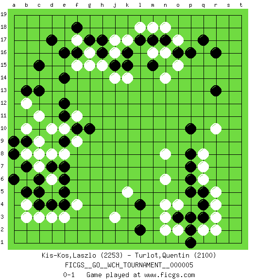 Last move : 0-1 2010 February 13 8:42:25 [Event "FICGS__GO__WCH_TOURNAMENT__000005"] [Site "FICGS"] [Date "2009.11.02"] [Round "1"] [Black "Kis-Kos,Laszlo"] [White "Turlot,Quentin"] [Result "0-1"] [Rating 1 "2253"] [Rating 2 "2100"] 1.r16 f4 2.d17 q6 3.c15 o17 4.q17 k17 5.q4 o4 6.p5 r3 7.q3 r4 8.p6 q7 9.l4 q2 10.p2 r2 11.q5 r5 12.d4 d6 13.e5 c3 14.c4 d3 15.e6 b4 16.b5 b3 17.e4 e3 18.d7 f17 19.h17 j16 20.h16 h15 21.f16 g16 22.g17 g15 23.f18 o15 24.r13 c11 25.j15 j14 26.k15 k14 27.k16 j17 28.l17 l18 29.m17 m18 30.m15 f15 31.e16 n14 32.o16 n16 33.n17 n18 34.p16 m16 35.e14 c7 36.c6 d8 37.e7 c8 38.c13 j3 39.e11 r10 40.b9 b6 41.c5 b10 42.b7 b8 43.a6 b12 44.a8 c9 45.a9 d10 46.e9 e10 47.f10 f11 48.e12 f9 49.g10 e8 50.b13 o2 51.o3 n3 52.p3 n4 53.l2 n2 54.p1 n6 55.p7 q8 56.p8 n8 57.p10 k5 0-1 This go game has been lost on time (started : 2009.11.02 23:2:34) Here are the names of the openings (joseki) played in the four corners : Corner q16 : r16 o17 Komoku (Somok, Xiao~mu`) 3-4 Point. The komoku (3-4) point is the traditional corner enclosure move.. Nikken Kakari (Dukan Keolch'im, E`r Gua`jiao~, 2-Space Low Approach). White 2 is used with friendly forces backing it up. Its purpose is to prevent a pincer. Locally it results in a loss, but may be appropriate fuseki strategy. It was popular in the late 1950s and early 1960s, but is not seen often nowadays, having been replaced by the one-space high approach, with which it has points in common. Corner q4 : q6 q4 Ootakamoku (Chaogao) 6-4 Point. The large takamoku (high) point (6-4), experimented with during the "new fuseki" movement in Japan in the 1930's. This point is seldom played as the initial corner point nowadays. Corner d4 : f4 d4 Ootakamoku (Chaogao) 6-4 Point. The large takamoku (high) point (6-4), experimented with during the "new fuseki" movement in Japan in the 1930's. This point is seldom played as the initial corner point nowadays. Player White won this Go (weiqi, baduk) game. Follow this game move after move (download)When your opponent has two weak groups, attack them both at once. (Anonymous) For to win one hundred victories in one hundred battles is not the acme of skill. To subdue the enemy without fighting is the acme of skill. (Sun Tzu)