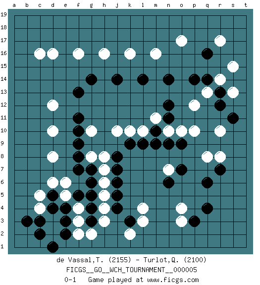 Last move : 0-1 2010 January 9 19:35:6 [Event "FICGS__GO__WCH_TOURNAMENT__000005"] [Site "FICGS"] [Date "2009.11.02"] [Round "1"] [Black "de Vassal,Thibault"] [White "Turlot,Quentin"] [Result "0-1"] [Rating 1 "2155"] [Rating 2 "2100"] 1.q4 d16 2.q16 d3 3.d5 f4 4.c3 c4 5.d4 c5 6.b3 d6 7.e3 d2 8.e4 f3 9.e2 f2 10.d1 e5 11.c2 e6 12.j4 l3 13.k3 l4 14.j6 o3 15.p3 o4 16.q6 n7 17.j8 r8 18.r7 q8 19.f5 h5 20.g5 h4 21.g4 h3 22.g3 g2 23.g6 h6 24.g7 h7 25.f8 h8 26.j7 d8 27.f9 d10 28.f11 g8 29.f7 g10 30.f10 j10 31.k9 k10 32.m9 d12 33.f13 l10 34.l9 n10 35.m10 m11 36.n9 o10 37.o9 p10 38.o7 f16 39.g14 h16 40.j14 k16 41.l14 c16 42.j5 k2 43.n6 m16 44.n14 o17 45.p14 r14 46.r13 s13 47.r12 r17 48.n11 p12 49.n12 q13 50.q14 s15 51.s11 r10 0-1 Comment by player 2 : Quentin Turlot : Yes, the correct answere is E5, E7, E2, F6, G3. The result is good for black but it's still ok for white. I played this cuz I know there is some tricky moves Xiao Tong move13 should at E5,then can get one of c6 or e3. Thibault de Vassal Good to know... :) Here are the names of the openings (joseki) played in the four corners : Corner d4 : d3 d5 Komoku (Somok, Xiao~mu`) 3-4 Point. The komoku (3-4) point is the traditional corner enclosure move.. Ikken Takagakari (Hankan Nop'dakeolch'im, Yi Gaogua`jiao~, 1-Space High Approach). The 5-4 approach move has become more popular in modern times, as modern Go emphasizes speed and influence. Corner q4 : q4 l3 Hoshi (Hwajeom, Seongjeom, Xingwei`) 4-4 Point. The star or hoshi (4-4) point, emphasizing influence at the potential expense of territory. Corner d16 : d16 f11 Hoshi (Hwajeom, Seongjeom, Xingwei`) 4-4 Point. The star or hoshi (4-4) point, emphasizing influence at the potential expense of territory. Corner q16 : q16 m11 Hoshi (Hwajeom, Seongjeom, Xingwei`) 4-4 Point. The star or hoshi (4-4) point, emphasizing influence at the potential expense of territory. Player White won this Go (weiqi, baduk) game. Follow this game move after move (download)Balance is not what players strike for, and if it does arise, it is in spite of them. (Pierre Audouard) Chess is everything: art, science and sport. (Anatoly Karpov)