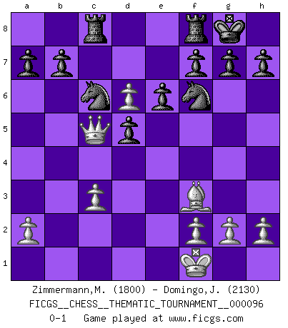 Last move : 0-1 2009 November 14 23:13:35 [Event "FICGS__CHESS__THEMATIC_TOURNAMENT__000096"] [Site "FICGS"] [Date "2009.11.03"] [Round "1"] [White "Zimmermann,Melchior"] [Black "Domingo,Jordi"] [Result "0-1"] [WhiteElo "1800"] [BlackElo "2130"] 1.e4 c6 2.d4 d5 3.e5 c5 4.c3 Nc6 5.Nf3 Bg4 6.Be2 e6 7.O-O Qb6 8.Be3 Bxf3 9.Bxf3 Qxb2 10.Qd2 Qxa1 11.Na3 Qxf1+ 12.Kxf1 cxd4 13.Nb5 dxe3 14.Qxe3 Rc8 15.Nd6+ Bxd6 16.exd6 Nf6 17.Qc5 O-O 0-1 Caro-Kann : Advance variation Kingside Castling by player White (move 7) Kingside Castling by player Black (move 17) Player Black won this chess game. Follow this game move after move (download)You cannot play at Chess if you are kind-hearted. (French Proverb) Ich war schon mal beim Dopingtest. Da musste ich Urin abgeben, während Dritte zusahen. (Elisabeth Pähtz) Con o sin el título, Bobby Fischer fue sin lugar a dudas el mas grande jugador de su época. (Burt Hochberg) Il s'avisa de me proposer d'apprendre les échecs qu'il jouait un peu... me voilà forcené des échecs. J'achète un échiquier, je m'enferme dans ma chambre, j'y passe des jours et des nuits à vouloir apprendre par cur toutes les parties. (Jean-Jacques Rousseau, Confessions) Who needs drugs and alcohol if he can play Big Chess at FICGS ? (Heinz-Georg Lehnhoff)
