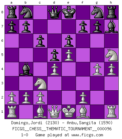 Last move : 1-0 2009 November 20 16:31:38 [Event "FICGS__CHESS__THEMATIC_TOURNAMENT__000096"] [Site "FICGS"] [Date "2009.11.03"] [Round "1"] [White "Domingo,Jordi"] [Black "Anbu,Sangita"] [Result "1-0"] [WhiteElo "2130"] [BlackElo "1590"] 1.e4 c6 2.d4 d5 3.e5 Bf5 4.Nc3 e6 5.g4 Bg6 6.Nge2 Bb4 7.h4 h5 8.Nf4 Bh7 9.Nxh5 1-0 Caro-Kann : Advance variation Player White won this chess game. Follow this game move after move (download)The Pawns are the soul of the game. (Francois Andre Danican Philidor) Lisa Lane, amerikanische Schachmeisterin, hatte Fischer einmal als stärksten lebenden Spieler bezeichnet. Antwort: Das ist richtig, aber Lisa Lane ist eigentlich nicht in der Lage, das zu beurteilen. (Robert James Fischer) Un entendimiento minucioso de las típicas continuaciones de mate hacen de las mas complicadas combinaciones de sacrificio que conducen hacia ellas no solo no dificiles, sino casi un asunto de rutina. (Siegbert Tarrasch) Il (Jacob Murray) ne joue pas pour le bon coup, mais pour le meilleur. (Eloi Relange) To be champion requires more than simply being a strong player; one has to be a strong human being as well. (Anatoly Karpov)