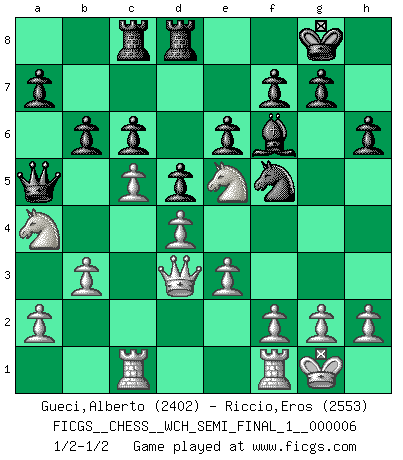 Last move : 1/2-1/2 2010 February 3 16:52:21 [Event "FICGS__CHESS__WCH_SEMI_FINAL_1__000006"] [Site "FICGS"] [Date "2009.11.03"] [Round "4"] [White "Gueci,Alberto"] [Black "Riccio,Eros"] [Result "1/2-1/2"] [WhiteElo "2402"] [BlackElo "2553"] 1.d4 d5 2.Bg5 c6 3.Nf3 h6 4.Bh4 Qb6 5.b3 Bf5 6.e3 e6 7.Bd3 Bxd3 8.Qxd3 Ne7 9.Bg3 Nf5 10.Bxb8 Rxb8 11.O-O Be7 12.c4 O-O 13.Nc3 Rfd8 14.Rac1 Qa5 15.c5 b6 16.Ne5 Rbc8 17.Na4 Bf6 1/2-1/2 Levitsky attack (Queen's Bishop attack) Kingside Castling by player White (move 11) Kingside Castling by player Black (move 12) This chess game ended in a draw. Follow this game move after move (download)Chess is above all, a fight ! (Emanuel Lasker) Stil? Ich habe keinen Stil! (Anatoly Karpov) En la vida, como en el Ajedrez, los Peones propios obstruyen nuestro camino. La gran fortuna de un hombre, su comodidad, placer, hijos, libros, que deberían ayudarle a ganar, con mucha frecuencia lo ponen en Jaque Mate. (Charles Buxton) La tactique est l'élément le plus important du milieu de jeu. (Siegbert Tarrasch) The best weapon against an enemy is another enemy. (Friedrich Nietzsche)