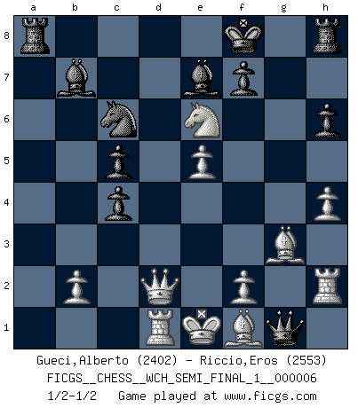 Last move : 1/2-1/2 2010 February 6 0:33:42 [Event "FICGS__CHESS__WCH_SEMI_FINAL_1__000006"] [Site "FICGS"] [Date "2009.11.03"] [Round "6"] [White "Gueci,Alberto"] [Black "Riccio,Eros"] [Result "1/2-1/2"] [WhiteElo "2402"] [BlackElo "2553"] 1.d4 Nf6 2.Nf3 d5 3.c4 c6 4.Nc3 e6 5.Bg5 h6 6.Bh4 dxc4 7.e4 g5 8.Bg3 b5 9.Ne5 Bb7 10.h4 g4 11.Nxg4 Nxg4 12.Qxg4 Qxd4 13.Rd1 Qf6 14.e5 Qf5 15.Qd4 Be7 16.a4 c5 17.Qd2 a6 18.axb5 axb5 19.Nxb5 Qe4+ 20.Be2 Qxg2 21.Nc7+ Kf8 22.Rh2 Qg1+ 23.Bf1 Nc6 24.Nxe6+ 1/2-1/2 Queen's pawn game This chess game ended in a draw. Follow this game move after move (download)It began to feel as though you were playing against Chess itself. - On playing against Robert Fischer. (Walter Shipman) Wie, soll nun auch die Opposition abgeschafft werden? Ja, es tut mir leid, Ihnen diesen Schmerz nicht ersparen zu können. (Aaron Nimzowitsch) El Ajedrez no es una pizca de inferior al violín, y tenemos un gran número de violinistas profesionales. (Mikhail Botvinnik) Le moment que je préfère le plus dans une rencontre, c'est celui où je sens que la personnalité de l'adversaire se brise. (Robert Fischer) Whoever said the pen is mightier than the sword obviously never encountered automatic weapons. (US General Douglas MacArthur)