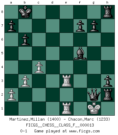Last move : 0-1 2006 October 17 12:19:49 [Event "FICGS__CHESS__CLASS_F__000013"] [Site "FICGS"] [Date "2006.10.02"] [Round "1"] [White "Martinez,Millan"] [Black "Chacon,Marc"] [Result "0-1"] [WhiteElo "1400"] [BlackElo "1233"] 1.e4 c5 2.d3 d6 3.Bf4 Nf6 4.e5 dxe5 5.Bxe5 Nc6 6.Bxf6 exf6 7.Nc3 Qe7+ 8.Be2 Bg4 9.f3 Bf5 10.g4 Bd7 11.Nh3 Nd4 12.O-O O-O-O 13.Nd5 Qd6 14.c4 h5 15.f4 Nxe2+ 16.Qxe2 hxg4 17.Nf2 f5 18.Rae1 Qg6 19.Qe3 Qh6 20.Nh3 gxh3 21.Rf3 Bd6 22.d4 cxd4 23.Qxd4 b6 24.Ne7+ Kb8 25.Rg3 Bc5 26.Qe3 Bxe3+ 27.R1xe3 Qxf4 28.b3 Qd4 29.Nxf5 Qd1+ 30.Kf2 Bxf5 31.Re1 Rd2+ 32.Kf1 Qc2 33.Rge3 Rf2+ 34.Kg1 Rg2+ 35.Kh1 Rxh2+ 36.Kg1 Qg2+ 0-1 Sicilian defense Kingside Castling by player White (move 12) Queenside Castling by player Black (move 12) Player Black won this chess game. Follow this game move after move (download)Even the laziest King flees wildly in the face of a double check ! (Aaron Nimzowitsch) Je älter ich werde, um so mehr schätze ich die Bauern. (Paul Keres) Botvinnik trataba de restarle el misterio al Ajedrez, siempre relacionandolo a situaciones de la vida ordinaria. El gustaba de llamar al Ajedrez un típico problema inexacto similar a aquellos de los cuales la gente siempre tiene que enfrentarse en la vida cotidiana. (Garry Kasparov) Les sacrifices démontrent seulement que quelqu'un a gaffé. (Savielly Tartacover) They say poker is a zero-sum game. It must be, because every time I play my sum ends up zero. (Max Shapiro)