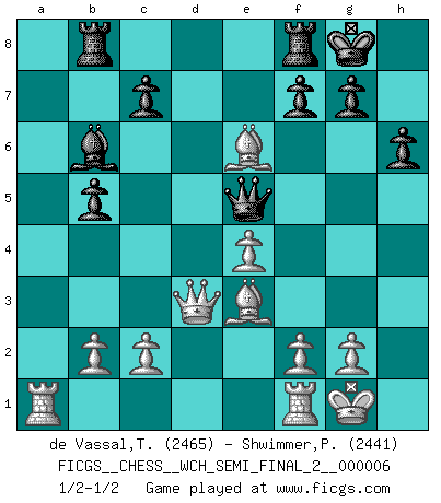 Last move : 1/2-1/2 2009 December 6 11:13:12 [Event "FICGS__CHESS__WCH_SEMI_FINAL_2__000006"] [Site "FICGS"] [Date "2009.11.03"] [Round "5"] [White "de Vassal,Thibault"] [Black "Shwimmer,Peter"] [Result "1/2-1/2"] [WhiteElo "2465"] [BlackElo "2441"] 1.e4 e5 2.Nc3 Nf6 3.Nf3 Nc6 4.Bb5 Bd6 5.d3 a6 6.Ba4 h6 7.Ne2 b5 8.Bb3 Bc5 9.a4 Rb8 10.axb5 axb5 11.O-O O-O 12.Ng3 d5 13.Nxe5 Nxe5 14.d4 Bb6 15.dxe5 Ng4 16.h3 Qh4 17.hxg4 Qxg3 18.Bxd5 Bxg4 19.Qd3 Qxe5 20.Be3 Be6 21.Bxe6 1/2-1/2 Vienna : Falkbeer variation Kingside Castling by player White (move 11) Kingside Castling by player Black (move 11) This chess game ended in a draw. Follow this game move after move (download)When you play Bobby, it is not a question if you win or lose. It is a question if you survive. (Boris Spassky) Der Freibauer hat für mich eine Seele, genau wie der Mensch, Wünsche, die unerkannt in ihm schlummern, und Befürchtungen, von deren Existenz er selbst kaum ahnt. (Aaron Nimzowitsch) Todos los jugadores de Ajedrez deberían tener un pasatiempo. (Savielly Tartakower) Je ne crois pas en la psychologie, je crois aux bons coups. (Robert Fischer) If you don't practice you don't deserve to win. (Andre Agassi)