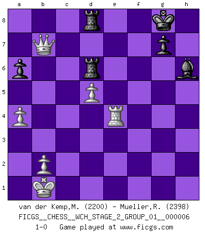 Last move : 1-0 2010 January 27 5:19:36 [Event "FICGS__CHESS__WCH_STAGE_2_GROUP_01__000006"] [Site "FICGS"] [Date "2009.11.03"] [Round "1"] [White "van der Kemp,Michel"] [Black "Mueller,Robert"] [Result "1-0"] [WhiteElo "2200"] [BlackElo "2398"] 1.e4 c5 2.Nf3 d6 3.d4 cxd4 4.Nxd4 Nf6 5.Nc3 a6 6.Be3 e6 7.a4 b6 8.f3 Be7 9.Qd2 Bb7 10.g4 O-O 11.g5 Nfd7 12.h4 Nc6 13.O-O-O b5 14.g6 hxg6 15.h5 Nxd4 16.Bxd4 Bg5 17.f4 Bh6 18.hxg6 fxg6 19.Bh3 Re8 20.Kb1 b4 21.Nd5 b3 22.Rdg1 Ne5 23.Qc3 bxc2+ 24.Qxc2 exd5 25.fxe5 dxe5 26.Rxg6 Qh4 27.Be6+ Rxe6 28.Rxh4 Rxg6 29.exd5 Rf6 30.Qb3 exd4 31.Qxb7 Rd8 32.Rxd4 Rfd6 33.Re4 1-0 Sicilian : Najdorf, Byrne (English) attack Kingside Castling by player Black (move 10) Queenside Castling by player White (move 13) Player White won this chess game. Follow this game move after move (download)There are two classes of men; those who are content to yield to circumstances and who play whist; those who aim to control circumstances, and who play Chess. (Mortimer Collins) Dein Körper muss in Topform sein. Dein Schach verfällt, wenn dein Körper verfällt. Der Körper kann nicht vom Geist getrennt werden. (Robert James Fischer) Un juego de Ajedrez es un dialogo, una conversación entre un jugador y su oponente. Cada movimiento del oponente puede contener amenazas o tropiezos, pero un jugador no se puede defender de las amenazas o tomar ventaja de los tropiezos si es que no se pregunta a sí mismo: ¿Que es lo que mi oponente va a hacer después de cada movida?. (Bruce A. Moon) Je ne suis pas le dernier à jouer lâchement des coups douteux pendant le zeïtnot de l'adversaire pour l'achever: en effet les coups qui font le plus peur sont ceux que l'on ne comprend pas. Je me fais souvent peur quand je joue. (Un professeur anonyme) The leaves of memory seemed to make a mournful rustling in the dark. (Henry Wadsworth Longfellow)