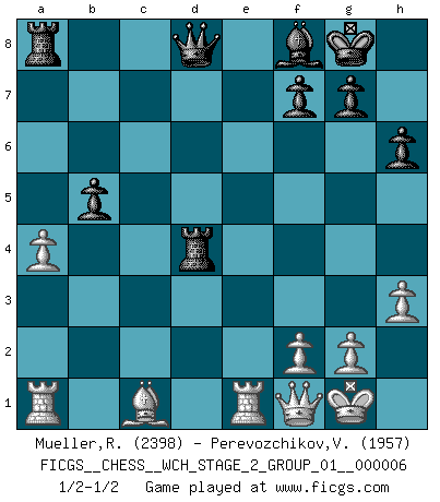 Last move : 1/2-1/2 2009 December 16 17:7:54 [Event "FICGS__CHESS__WCH_STAGE_2_GROUP_01__000006"] [Site "FICGS"] [Date "2009.11.03"] [Round "1"] [White "Mueller,Robert"] [Black "Perevozchikov,Vjacheslav"] [Result "1/2-1/2"] [WhiteElo "2398"] [BlackElo "1957"] 1.e4 e5 2.Nf3 Nc6 3.Bb5 a6 4.Ba4 Nf6 5.O-O Be7 6.Re1 b5 7.Bb3 d6 8.c3 O-O 9.h3 Bb7 10.d4 Re8 11.Nbd2 Bf8 12.Ng5 Re7 13.d5 Na5 14.Bc2 c6 15.b4 Nc4 16.Nxc4 bxc4 17.dxc6 Bxc6 18.Qe2 Rc8 19.a4 h6 20.Nf3 d5 21.exd5 Nxd5 22.Qd2 e4 23.Nd4 Rd7 24.b5 Ba8 25.Bxe4 Nxc3 26.Qxc3 Rxd4 27.Bxa8 Rd3 28.Qc2 Rxa8 29.Qxc4 Rd4 30.Qf1 axb5 1/2-1/2 Ruy Lopez : Closed Kingside Castling by player White (move 5) Kingside Castling by player Black (move 8) This chess game ended in a draw. Follow this game move after move (download)My style is somewhere between that of Tal and Petrosian. (Reshevsky) Alle Schachspieler sollten auch ein Hobby haben. (Savielly Grigorievitsch Tartakower) Cuando me preguntan: -¿Cual es el secreto que te hace hacer mejores movidas que tus oponentes?, Yo respondo: Me da gusto que me pregunten eso, porque, como veran, hay una simple razón. Yo pienso mis propias movidas y dejo a mi oponente que el piense las suyas. (Alexander Alekhine) Si je n'étais pas joueur d'échecs, je serais le meilleur dans quelque chose d'autre. (Anatoli Karpov) Art is the only way to run away without leaving home. (Twyla Tharp)