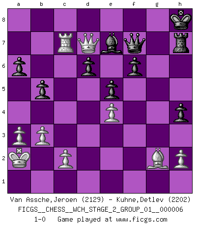 Last move : 1-0 2010 March 4 15:32:50 [Event "FICGS__CHESS__WCH_STAGE_2_GROUP_01__000006"] [Site "FICGS"] [Date "2009.11.03"] [Round "1"] [White "Van Assche,Jeroen"] [Black "Kuhne,Detlev"] [Result "1-0"] [WhiteElo "2129"] [BlackElo "2202"] 1.e4 c5 2.Nf3 d6 3.d4 cxd4 4.Nxd4 Nf6 5.Nc3 a6 6.Bg5 Nc6 7.Qd2 e6 8.O-O-O Bd7 9.f4 h6 10.Bh4 b5 11.Bxf6 gxf6 12.Kb1 Qb6 13.Nxc6 Bxc6 14.f5 h5 15.Qe1 Be7 16.fxe6 fxe6 17.Bd3 Kf7 18.Rf1 Rag8 19.Ne2 Rxg2 20.Nf4 Rg7 21.Be2 e5 22.Nd5 Bxd5 23.Rxd5 Kf8 24.Qc3 Rg1 25.Rfd1 Rxd1+ 26.Bxd1 Kf7 27.Qb3 Kf8 28.a3 Qg1 29.Qh3 Kf7 30.Ka2 Qg6 31.Bf3 Qg5 32.Rd3 Qg6 33.Rc3 Kg7 34.Rc7 Qf7+ 35.b3 Rh7 36.Bg2 h4 37.Qg4+ Kh8 38.Qd7 1-0 Sicilian : Najdorf, 6.Bg5 Queenside Castling by player White (move 8) Player White won this chess game. Follow this game move after move (download)The beauty of a move lies not in its' appearance but in the thought behind it. (Siegbert Tarrasch) Um dein Spiel zu verbessern musst du zuallererst das Endspiel studieren, denn diese kann unabhängig studiert werden. Die Eröffnung und das Mittelspiel müssen immer in Bezug gesetzt werden zum Endspiel. (José Raúl Capablanca) No todos los artistas son jugadores de Ajedrez, pero todos los jugadores de Ajedrez son artistas. (Marcel Duchamp) La tactique est l'élément le plus important du milieu de jeu. (Siegbert Tarrasch) The intuitive mind is a sacred gift; the rational mind is a faithful servant. We have created a society that honors the servant but has forgotten the gift. (Albert Einstein)