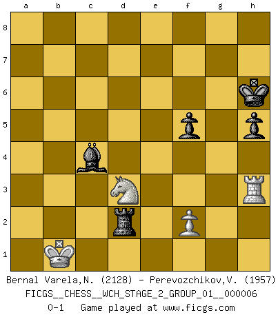 Last move : 0-1 2010 March 15 2:6:11 [Event "FICGS__CHESS__WCH_STAGE_2_GROUP_01__000006"] [Site "FICGS"] [Date "2009.11.03"] [Round "1"] [White "Bernal Varela,Nelson"] [Black "Perevozchikov,Vjacheslav"] [Result "0-1"] [WhiteElo "2128"] [BlackElo "1957"] 1.e4 c6 2.d4 d5 3.exd5 cxd5 4.c4 Nf6 5.Nc3 Nc6 6.Nf3 Bg4 7.Be3 e6 8.c5 Be7 9.h3 Bh5 10.Bb5 O-O 11.Bxc6 bxc6 12.g4 Bg6 13.Ne5 Rc8 14.Qa4 Qc7 15.Bf4 Qb7 16.Qb3 Qa6 17.O-O-O Rfd8 18.h4 Nd7 19.h5 Nxe5 20.Bxe5 Bd3 21.h6 f6 22.Bg3 Bg6 23.hxg7 e5 24.dxe5 Rb8 25.Qa4 Qxa4 26.Nxa4 Rb4 27.b3 Rxg4 28.e6 f5 29.Be5 Bg5+ 30.Kb2 Re8 31.Nc3 Rxe6 32.Bd4 h5 33.b4 Bh6 34.b5 Bxg7 35.Bxg7 Kxg7 36.bxc6 Rxc6 37.Rxd5 Rc4 38.Rd7+ Kh6 39.Rxa7 R4xc5 40.Ra3 Rd6 41.Ka1 Rd3 42.Na4 Rxa3 43.Nxc5 Bf7 44.Kb1 Rxa2 45.Nd3 Rd2 46.Rh3 Bc4 0-1 Caro-Kann : Panov-Botvinnik attack Kingside Castling by player Black (move 10) Queenside Castling by player White (move 17) 10 pieces endgame at move 43 : White KRNPP , Black KRBPP WHITE : King + 1 Rook 1 Knight 2 Pawns BLACK : King + 1 Rook 1 Bishop 2 Pawns 9 pieces endgame at move 44 : White KRNP , Black KRBPP WHITE : King + 1 Rook 1 Knight 1 Pawn BLACK : King + 1 Rook 1 Bishop 2 Pawns Player Black won this chess game. Follow this game move after move (download)No price is too great for the scalp of the enemy King. (Koblentz) Zum Sieg gelangt man nicht, wenn man gut, sondern nur wenn man besser spielt (Savielly Grigorievitsch Tartakower) El Ajedrez es un mar en el cual un mosquito puede beber y un elefante puede bañarse. (Refrán Hindú) Le jeu d'échecs fait naître et fortifie en nous plusieurs qualités précieuses dans le cours de l'existence, telles que la prévoyance, la circonspection, la prudence, et la persévérance. (Benjamin Franklin - 1783, la morale des échecs) There is no instance of a country having benefited from prolonged warfare. (Sun Tzu)