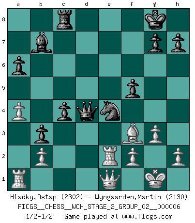 Last move : 1/2-1/2 2010 March 21 19:30:46 [Event "FICGS__CHESS__WCH_STAGE_2_GROUP_02__000006"] [Site "FICGS"] [Date "2009.11.03"] [Round "1"] [White "Hladky,Ostap"] [Black "Wyngaarden,Martin"] [Result "1/2-1/2"] [WhiteElo "2302"] [BlackElo "2130"] 1.Nf3 Nf6 2.d4 d5 3.c4 c6 4.Nc3 e6 5.e3 Nbd7 6.Qc2 Bd6 7.Bd3 O-O 8.O-O dxc4 9.Bxc4 a6 10.Rd1 b5 11.Be2 Qc7 12.Ne4 Nxe4 13.Qxe4 e5 14.Qd3 exd4 15.Qxd4 Be7 16.Qe4 Bf6 17.Qc2 c5 18.a4 b4 19.e4 Bb7 20.Be3 b3 21.Qb1 Rfe8 22.Nd2 Be5 23.g3 Nf6 24.Bf3 Rad8 25.Rc1 Qb6 26.Ra3 Rxd2 27.Bxd2 Bd4 28.Re1 c4 29.Be3 Nxe4 30.Bxd4 Qxd4 31.Re2 f5 32.Qe1 Rc8 33.Ra1 1/2-1/2 Reti Opening Kingside Castling by player Black (move 7) Kingside Castling by player White (move 8) This chess game ended in a draw. Follow this game move after move (download)There just isn't enough televised Chess. (David Letterman) Im Wettkampf zwischen starken Meistern kommen Fehler sehr selten vor, deshalb ist es mit bloßem Warten nicht getan. (José Raúl Capablanca) En el Ajedrez, tal como es jugado por los Maestros, practicamente la suerte es eliminada. (Emanuel Lasker) Il n'y a pas eu de défaite parce que je ne crois pas que cet ordinateur ait jamais existé. IBM a triché en refusant d'imprimer les modes de recherche de la machine. C'est évident, pendant le match, des coups décisifs ont été joués par des êtres humains. Aujourd'hui, les meilleurs spécialistes en informatique ne peuvent toujours pas expliquer comment Deep-Blue a pu jouer contre la logique des ordinateurs. IBM a gagné une guerre de communication, mais ils sont incapables de prouver que l'ordinateur a gagné tout seul. (Garry Kasparov) If you are good, you will be assigned all the work. If you are really good, you will get out of it. (Dan Rotaru)