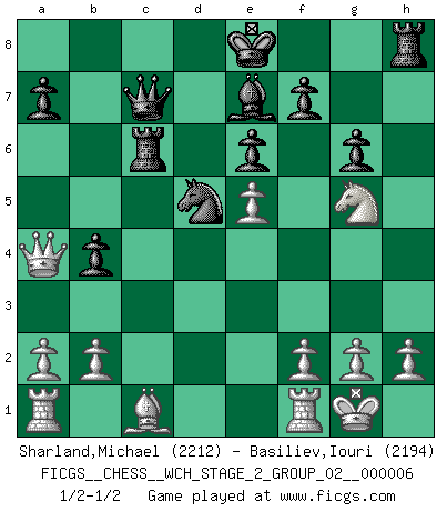 Last move : 1/2-1/2 2009 December 31 2:34:3 [Event "FICGS__CHESS__WCH_STAGE_2_GROUP_02__000006"] [Site "FICGS"] [Date "2009.11.03"] [Round "1"] [White "Sharland,Michael"] [Black "Basiliev,Iouri"] [Result "1/2-1/2"] [WhiteElo "2212"] [BlackElo "2194"] 1.d4 d5 2.c4 c6 3.Nc3 Nf6 4.e3 e6 5.Nf3 Nbd7 6.Bd3 dxc4 7.Bxc4 b5 8.Bd3 Bb7 9.e4 b4 10.Na4 c5 11.e5 Nd5 12.O-O Rc8 13.Nxc5 Nxc5 14.dxc5 Bxc5 15.Ng5 Be7 16.Nxh7 g6 17.Bb5+ Bc6 18.Bxc6+ Rxc6 19.Qa4 Qc7 20.Ng5 1/2-1/2 QGD Slav defense Kingside Castling by player White (move 12) This chess game ended in a draw. Follow this game move after move (download)A thorough understanding of the typical mating continuations makes the most complicated sacrificial combinations leading up to them not only not difficult, but almost a matter of course. (Siegbert Tarrasch) Es hat in meinem Leben Zeiten gegeben, in denen das Schachspiel, wenn nicht zum Lebenszweck, so doch zu einem regelrechten Lebensersatz geworden ist. Man fühlt sich in solchen Zeiten nicht so, als besäße man eine göttliche Gabe, sondern eher so, als sei man von ihr besessen. (Garry Kasparov) Una compensación adecuada por un sacrificio es tener una combinación sólida que conduce a una posición ganadora; una compensación adecuada por una metida de pata es dejar a tu oponente arrebatar una derrota de las fauces de la victoria. (Bruce A. Moon) La tactique est l'élément le plus important du milieu de jeu. (Siegbert Tarrasch) Locking firmely the window serves nothing, only small thiefs pass through there, the big thiefs enter through the front door. (Luc-Olivier Leclerc)