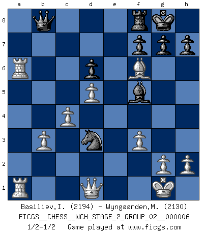 Last move : 1/2-1/2 2010 April 4 19:26:10 [Event "FICGS__CHESS__WCH_STAGE_2_GROUP_02__000006"] [Site "FICGS"] [Date "2009.11.03"] [Round "1"] [White "Basiliev,Iouri"] [Black "Wyngaarden,Martin"] [Result "1/2-1/2"] [WhiteElo "2194"] [BlackElo "2130"] 1.e4 c5 2.Nf3 d6 3.d4 cxd4 4.Nxd4 Nf6 5.Nc3 a6 6.Bc4 e6 7.Bb3 b5 8.O-O Be7 9.Qf3 Qb6 10.Be3 Qb7 11.Qg3 b4 12.Na4 Nbd7 13.f3 O-O 14.Rfd1 Ne5 15.a3 bxa3 16.Rxa3 Bd7 17.Nb6 Nh5 18.Qe1 Qxb6 19.Nxe6 Qb7 20.Nxf8 Rxf8 21.Rda1 Bb5 22.Bd5 Qb8 23.b3 Nf6 24.Qd1 Nxd5 25.exd5 Bf6 26.c4 Bd7 27.Rxa6 Bf5 28.Bd4 Nd3 29.Bxf6 1/2-1/2 Sicilian : Najdorf, Lipnitzky attack Kingside Castling by player White (move 8) Kingside Castling by player Black (move 13) This chess game ended in a draw. Follow this game move after move (download)There are tough players and nice guys, and I'm a tough player. (Bobby Fischer) Es genügt nicht ein guter Spieler zu sein, man muß auch gut spielen. (Siegbert Tarrasch) Buenas posiciones no logran ganar juegos, buenas movidas sí. (Gerald Abrahams) J'ai toujours senti une vague pitié pour l'homme qui ne connaît rien aux échecs, tout comme j'en aurais pour un homme ignorant de l'amour. Les Echecs, comme la musique ou comme l'amour, ont le pouvoir de rendre heureux. (Siegbert Tarrasch) As a goal marker shodan is important. As a destination it is a poor place to stop. (Thomas Tamayo)