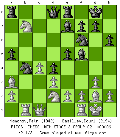 Last move : 1/2-1/2 2010 March 12 18:4:27 [Event "FICGS__CHESS__WCH_STAGE_2_GROUP_02__000006"] [Site "FICGS"] [Date "2009.11.03"] [Round "1"] [White "Mamonov,Petr"] [Black "Basiliev,Iouri"] [Result "1/2-1/2"] [WhiteElo "1942"] [BlackElo "2194"] 1.c4 e6 2.b3 Nf6 3.Nf3 d5 4.Bb2 c5 5.g3 d4 6.b4 a6 7.bxc5 Bxc5 8.d3 Nc6 9.Bg2 O-O 10.O-O e5 11.Nbd2 h6 12.Nb3 Bd6 13.Nfd2 Be7 14.Rb1 Re8 15.Qc1 a5 16.Ba3 Bf5 17.Nc5 Nb4 18.Nxb7 1/2-1/2 English Opening Kingside Castling by player Black (move 9) Kingside Castling by player White (move 10) This chess game ended in a draw. Follow this game move after move (download)Discovered check is the dive bomber of the Chessboard. (Reuben Fine) Ich habe die besten Aussichten, den ersten Preis zu gewinnen - denn jeder muss gegen Steinitz spielen, nur ich nicht! (Wilhelm Steinitz) No soy una persona materialista y por eso, no resiento la falta o pérdida del dinero. La ausencia de cosas mundanas carece de importancia. Ya que el Ajedrez es una forma en la que puedo ser tan materialista como yo desee sin tener la necesidad de vender mi alma. (Jamie Walter Adams) On n'a jamais que l'âge auquel on a commence à jouer aux échecs car après on cesse de vieillir. (Capablanca) Information on the Internet is subject to the same rules and regulations as conversation at a bar. (George Lundberg)